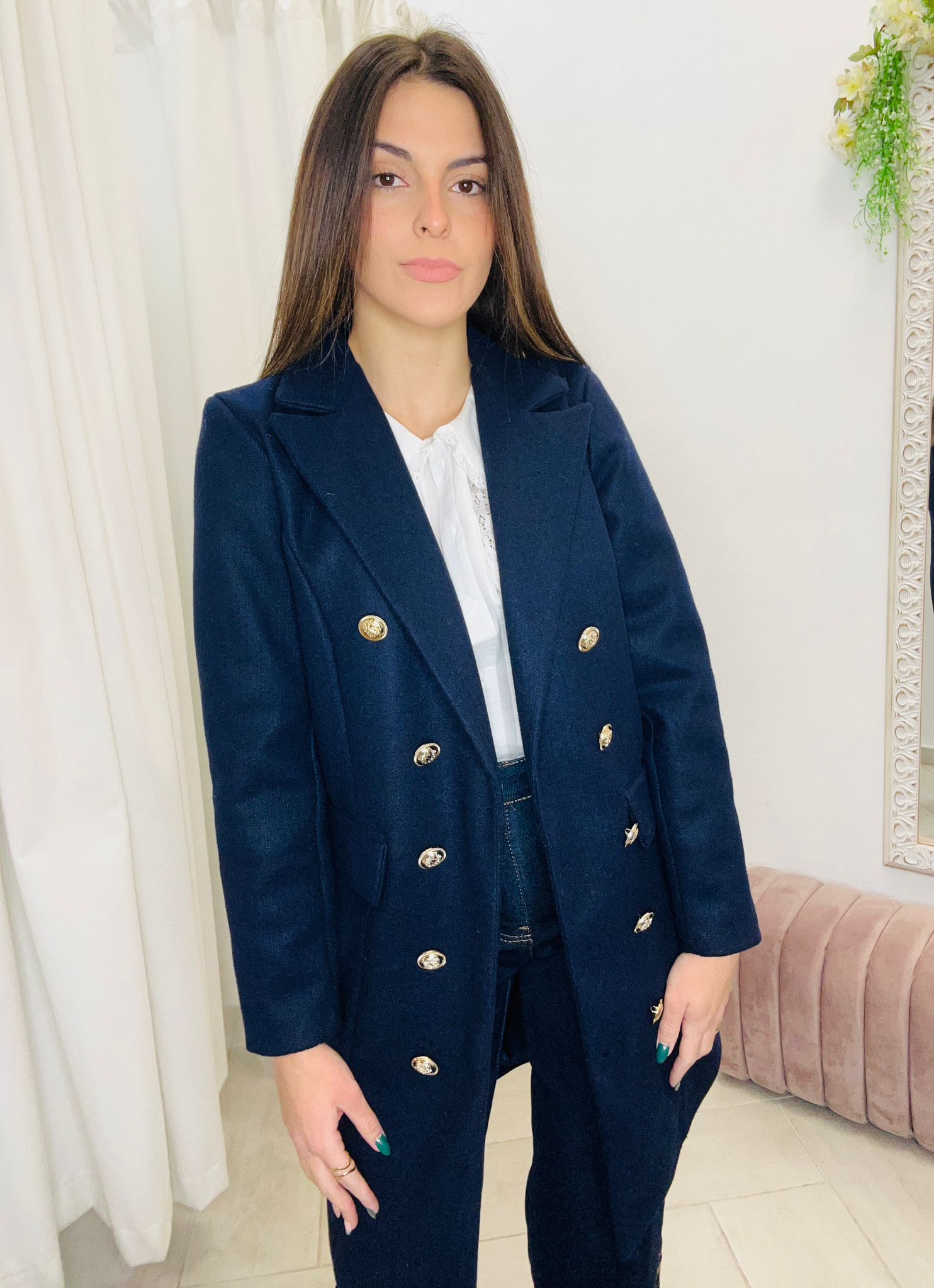 Abrigo azul marino de corte clásico, elegante y atemporal.