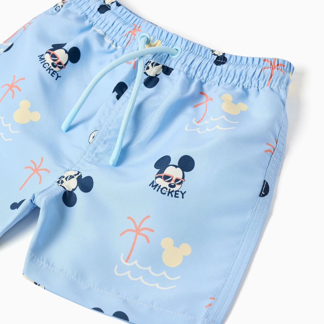Diseño Disney Oficial: Estampado integral de Mickey Mouse con palmeras y olas, ideal para estimular la imaginación durante las vacaciones.