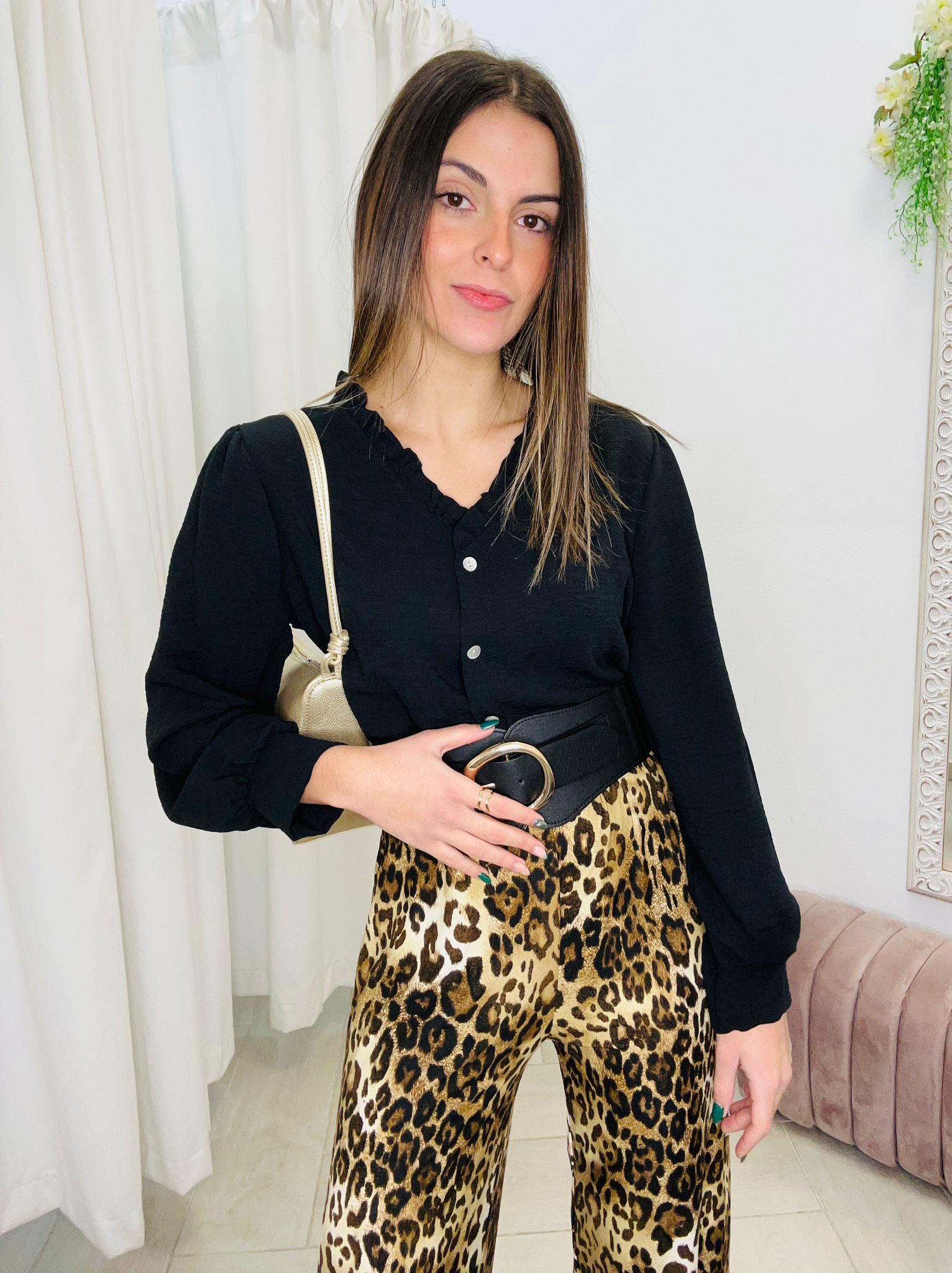 Añade un toque elegante a tu look con esta blusa negra, diseñada con un cuello en pico decorado con delicada blonda que aporta sofisticación y feminidad.
