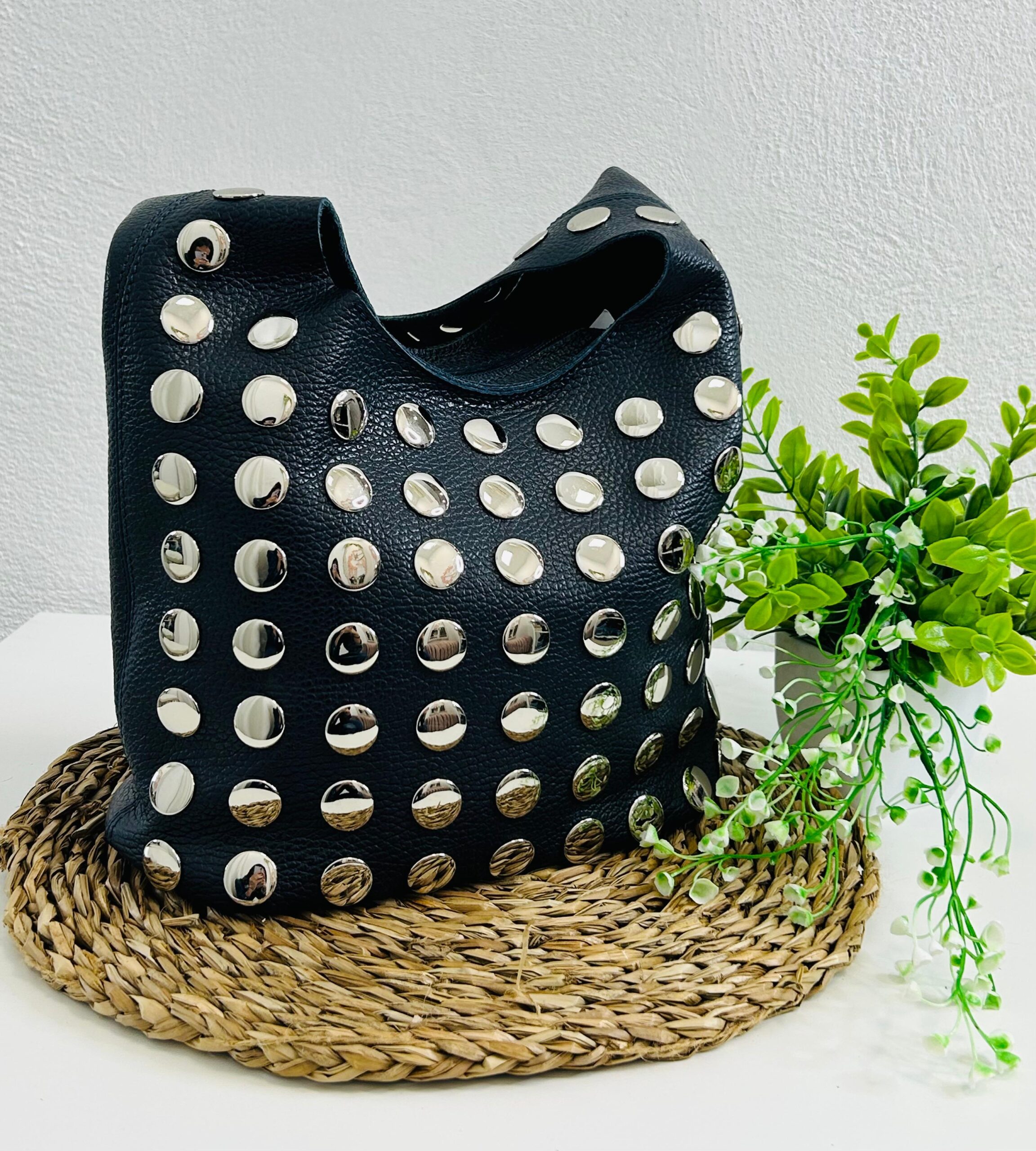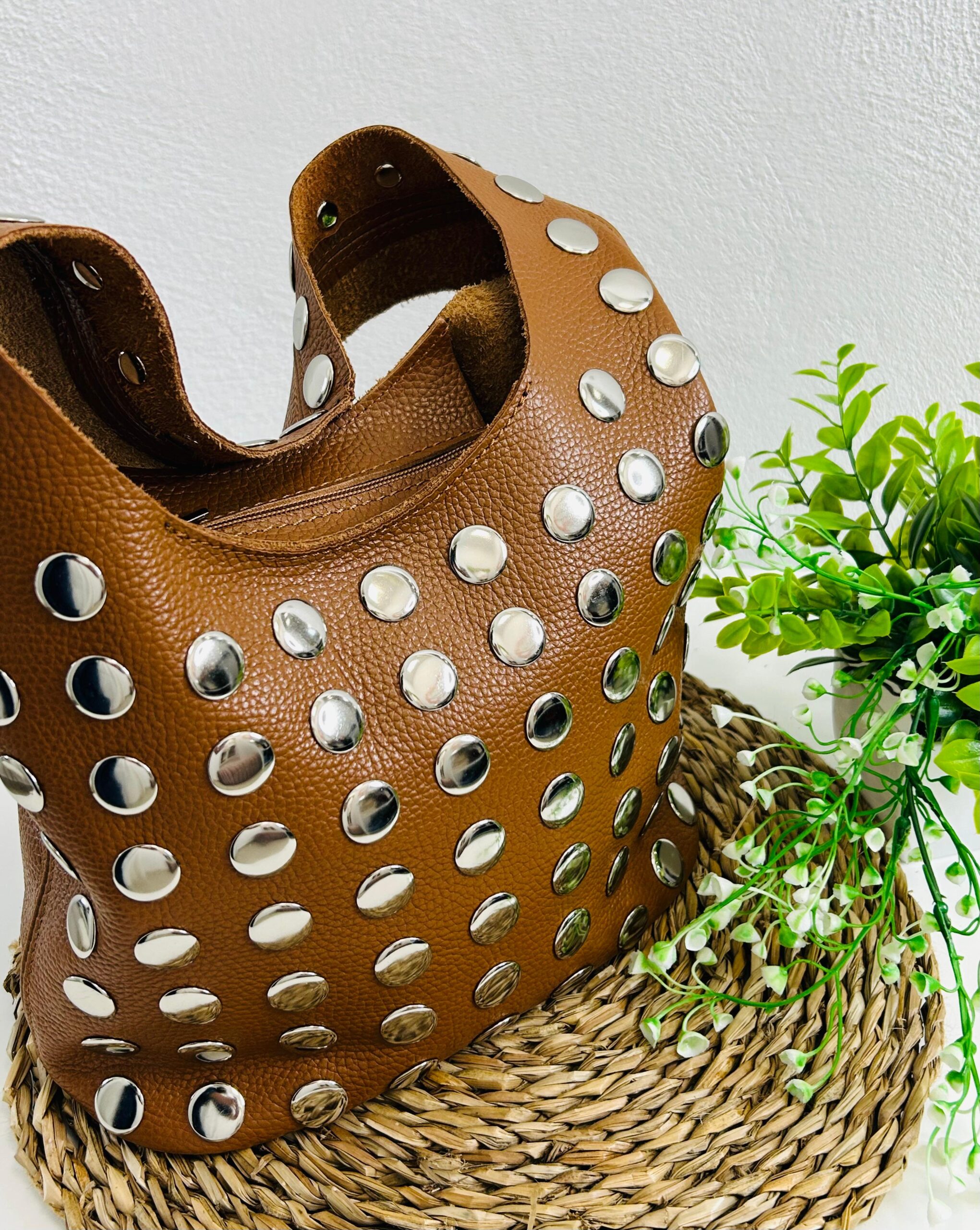 Confeccionado en polipiel de textura granulada, destaca por sus apliques metálicos redondos que aportan un toque sofisticado y contemporáneo.