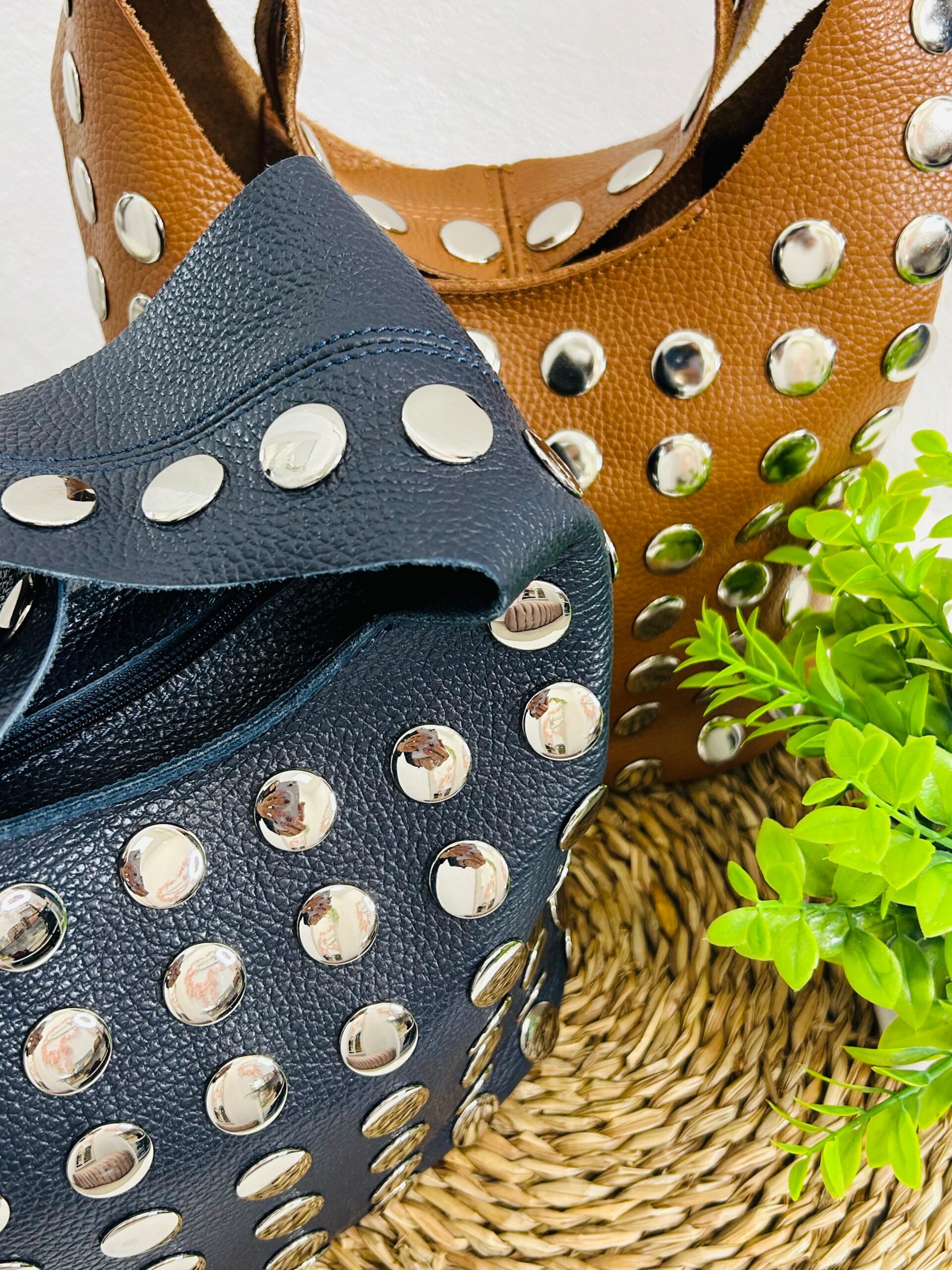 Disponible en camel y marino, este bolso es perfecto para completar tanto looks casuales como más urbanos o elegantes.