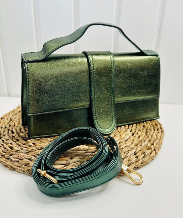 Este bolso rectangular metalizado en color verde destaca por su diseño moderno y llamativo.