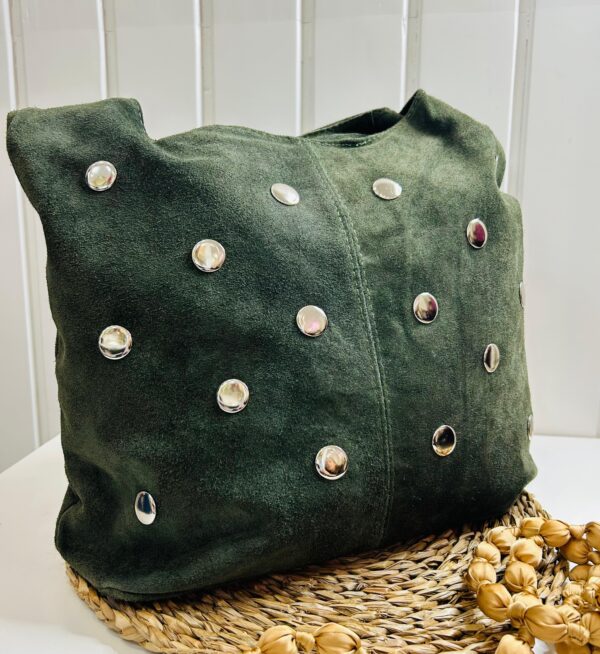 Elaborado en ante suave de color verde militar, destaca por su diseño decorado con tachuelas plateadas que le aportan un estilo urbano y contemporáneo.