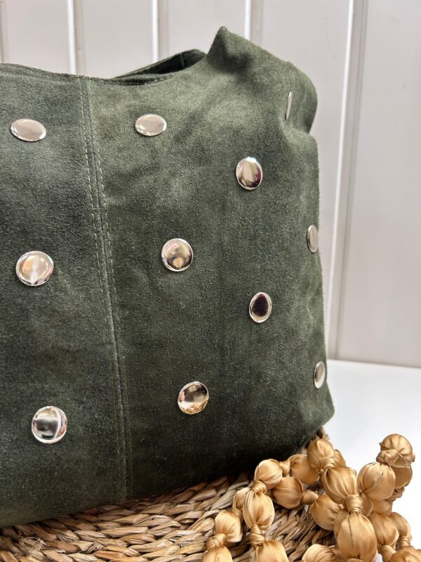 Elaborado en ante suave de color verde militar, destaca por su diseño decorado con tachuelas plateadas que le aportan un estilo urbano y contemporáneo.