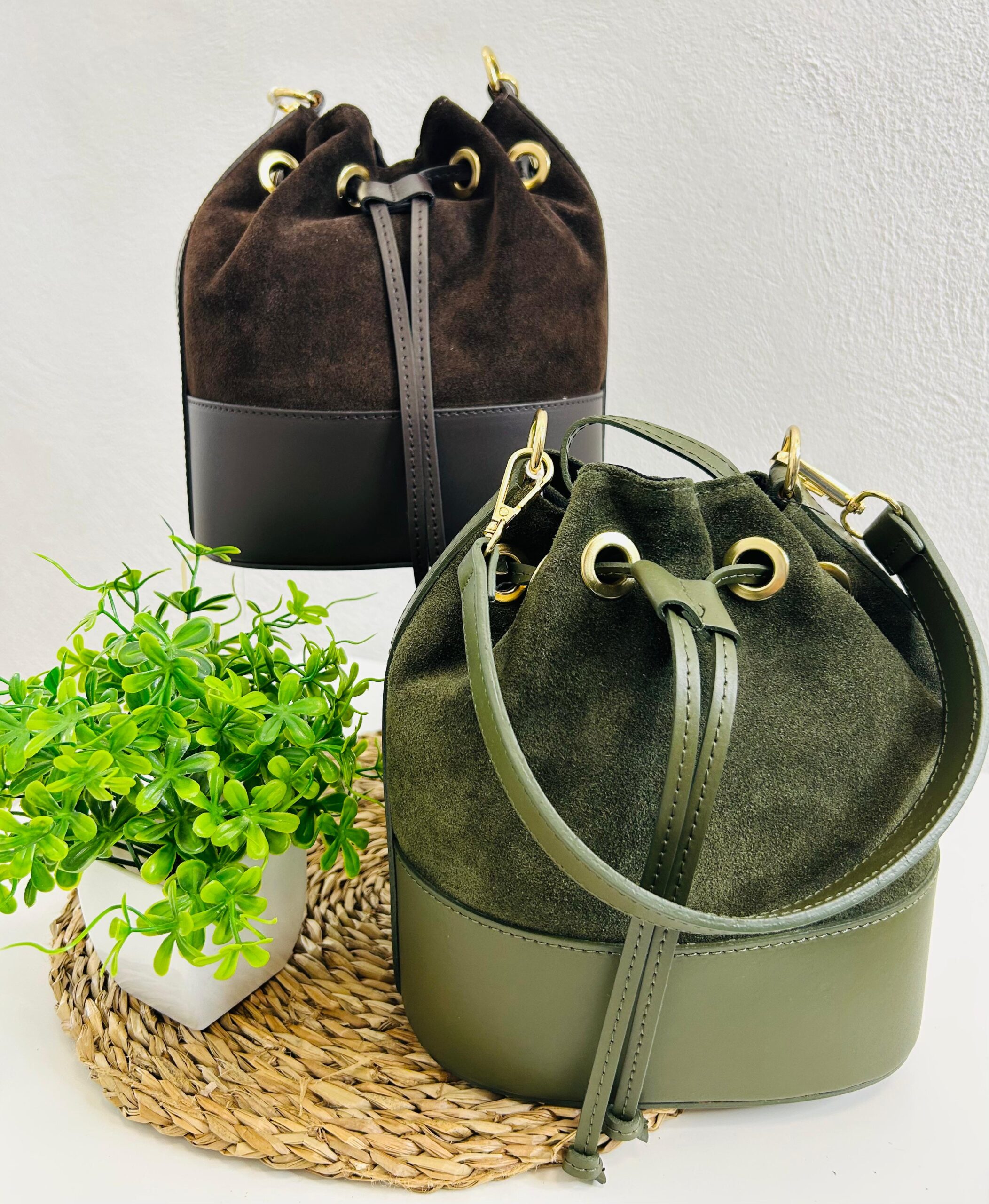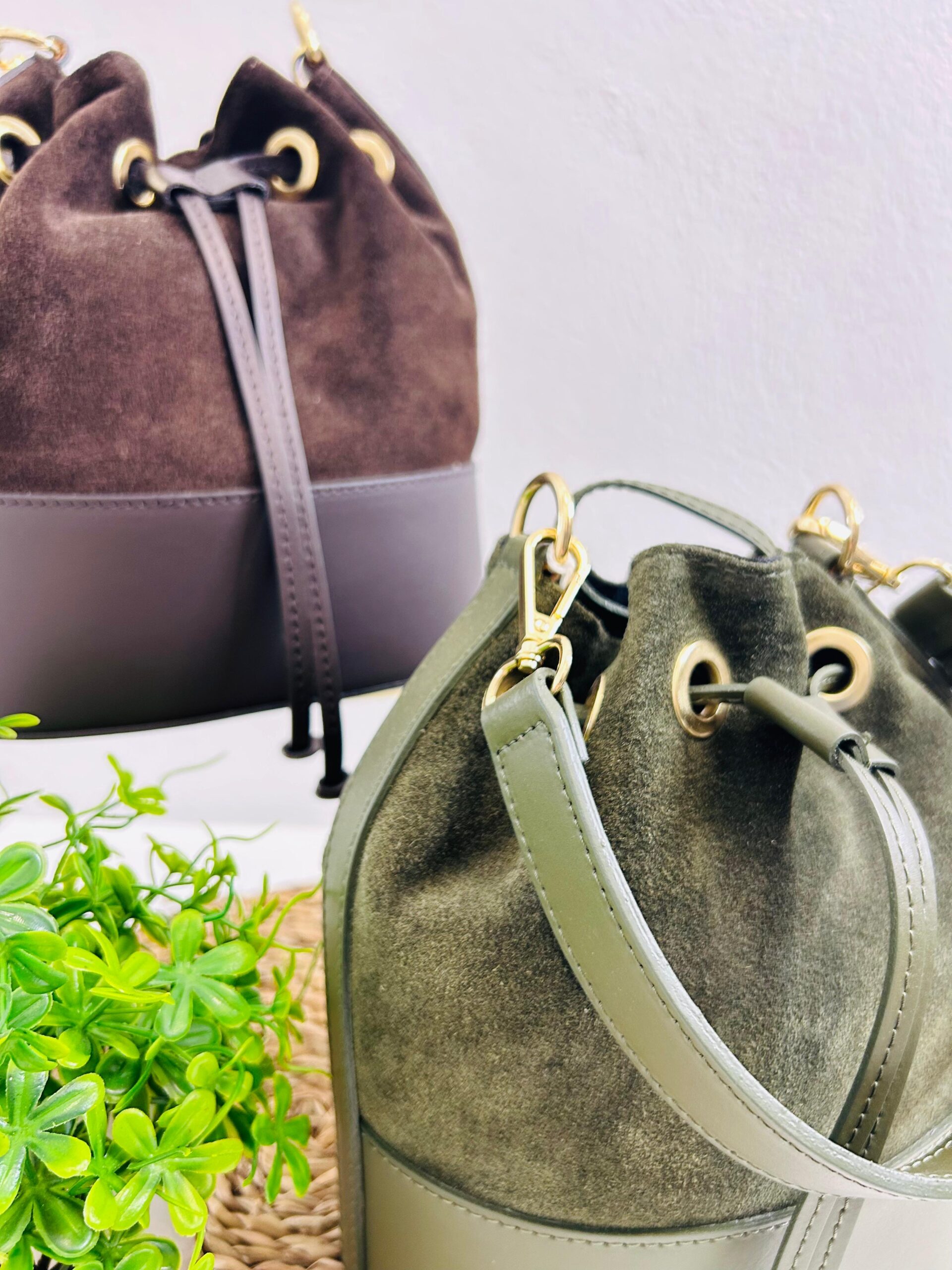 Disponible en dos tonos atemporales —verde oliva y marrón chocolate—, cada uno decorado con herrajes dorados que añaden un toque sofisticado.