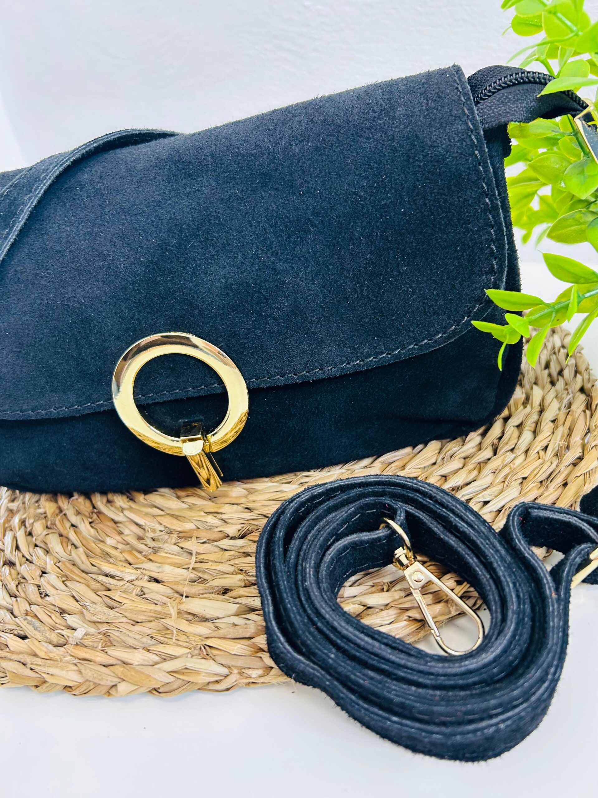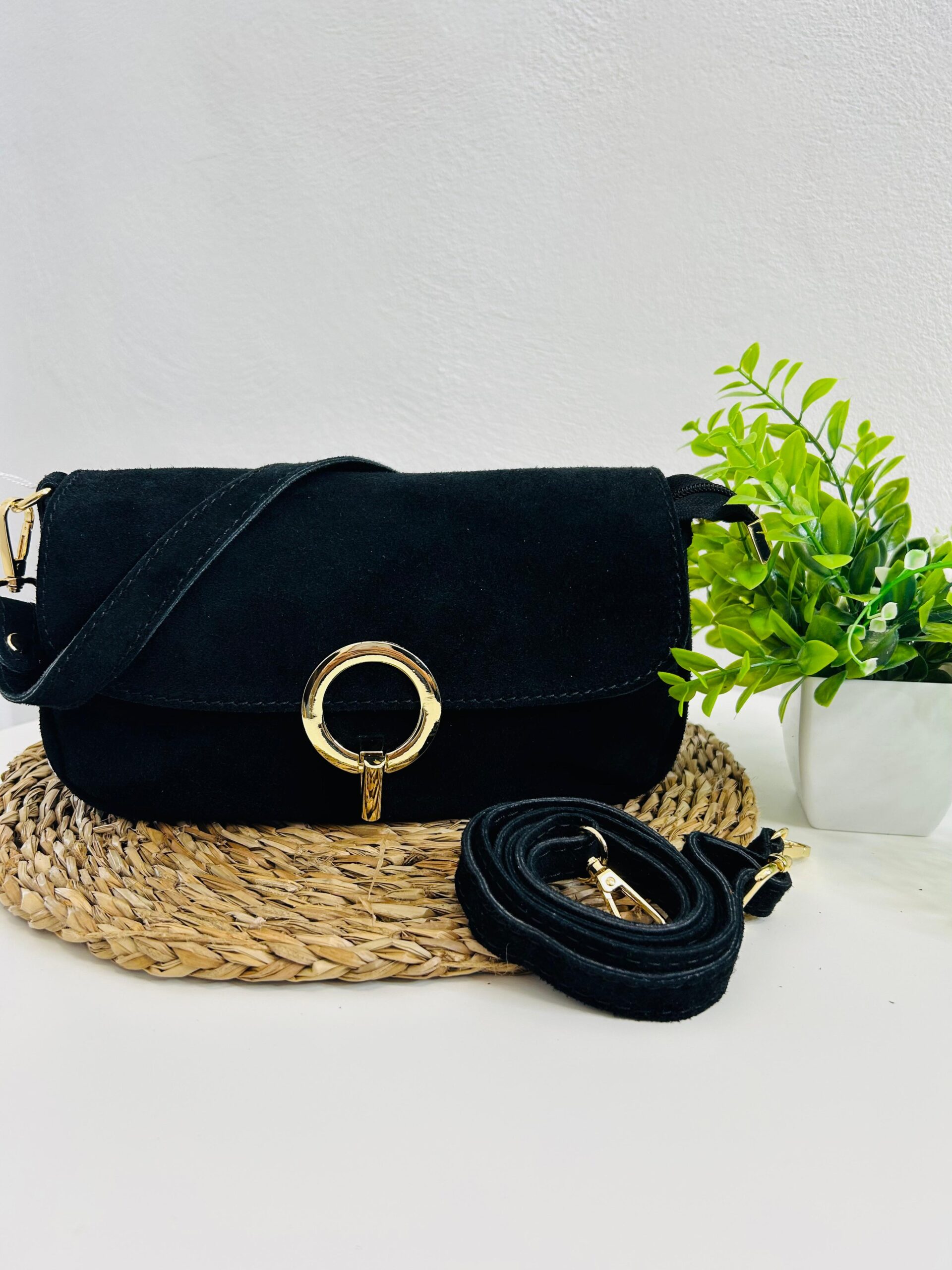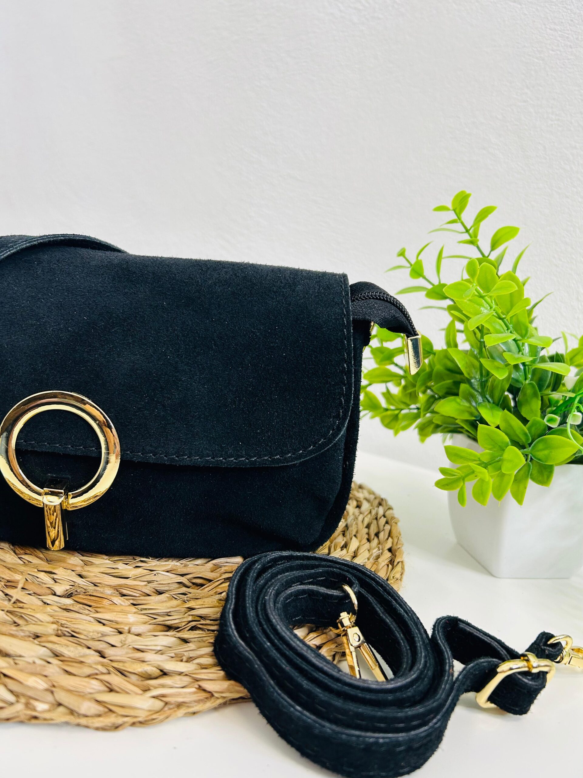 Su acabado en ante negro aporta un toque suave y sofisticado, mientras que el detalle frontal de aro dorado convierte este diseño en un accesorio moderno y atemporal.