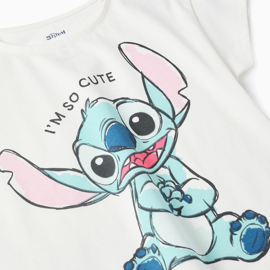 Diseño Disney Adorable: La camiseta blanca de manga corta presenta un gráfico frontal de Stitch con la frase «I’m so cute», mientras que la falda-pantalón incluye un detalle bordado a juego.