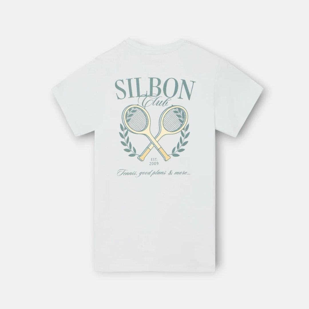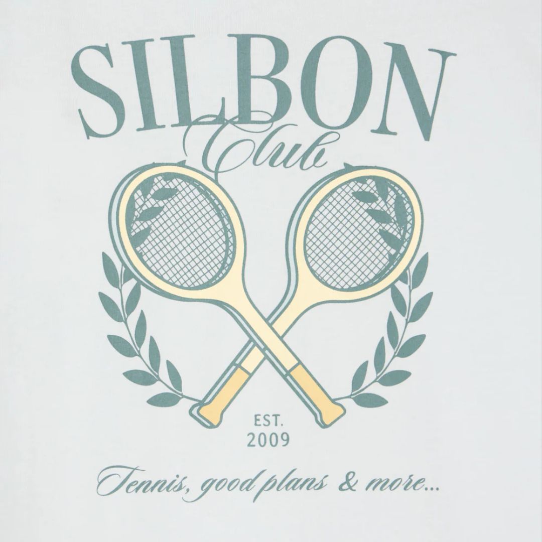 Diseño Central: Gráfico de inspiración retro con el texto «SILBON Club» y una ilustración de raquetas vintage cruzadas, rodeadas por una corona de laurel.