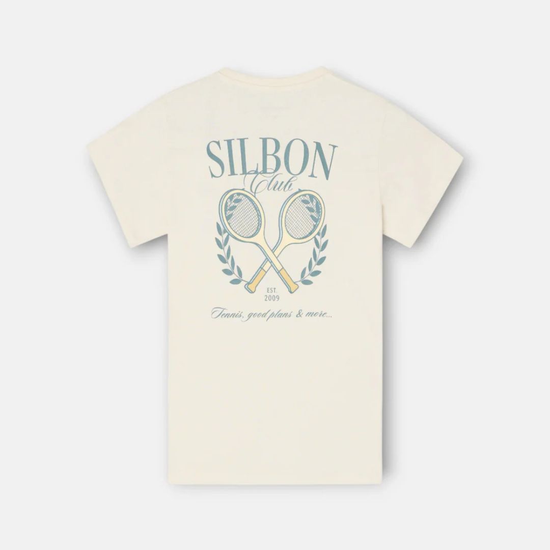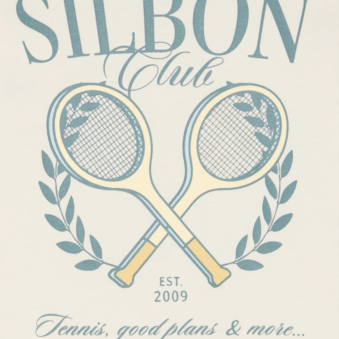 Inspiración Tenística: Presenta un gráfico central de estilo retro con el logotipo «SILBON Club», raquetas cruzadas y una corona de laurel en tonos verde suave y amarillo.