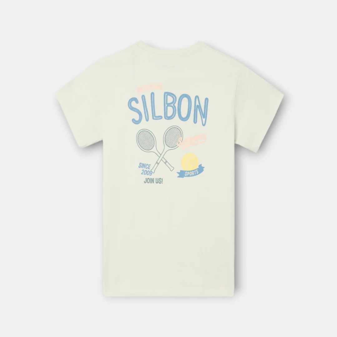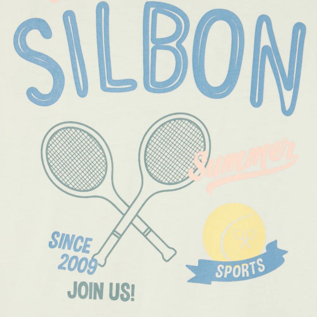 Gráfico Dinámico: Presenta un diseño central de inspiración tenística con el nombre «SILBON» en relieve azul, acompañado de raquetas cruzadas y una pelota de tenis en amarillo sol.