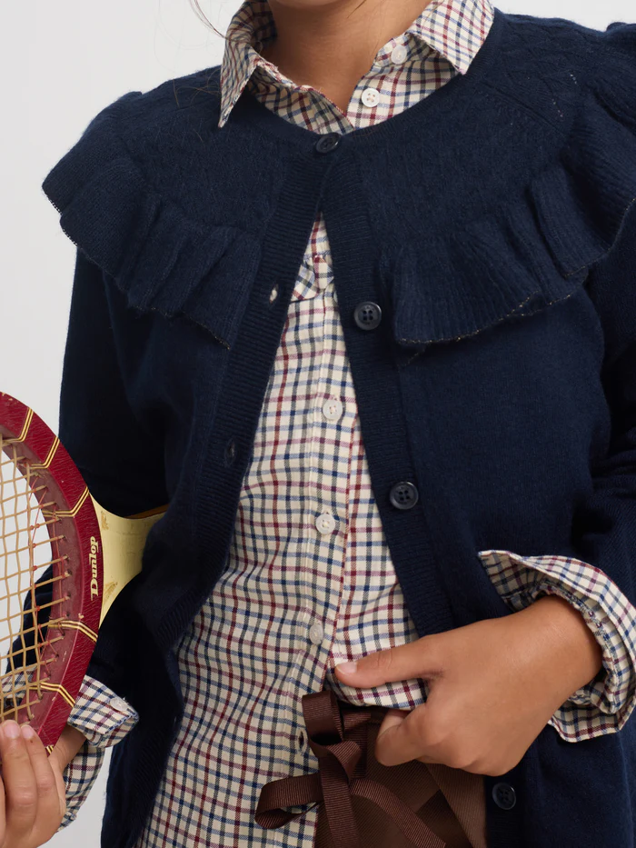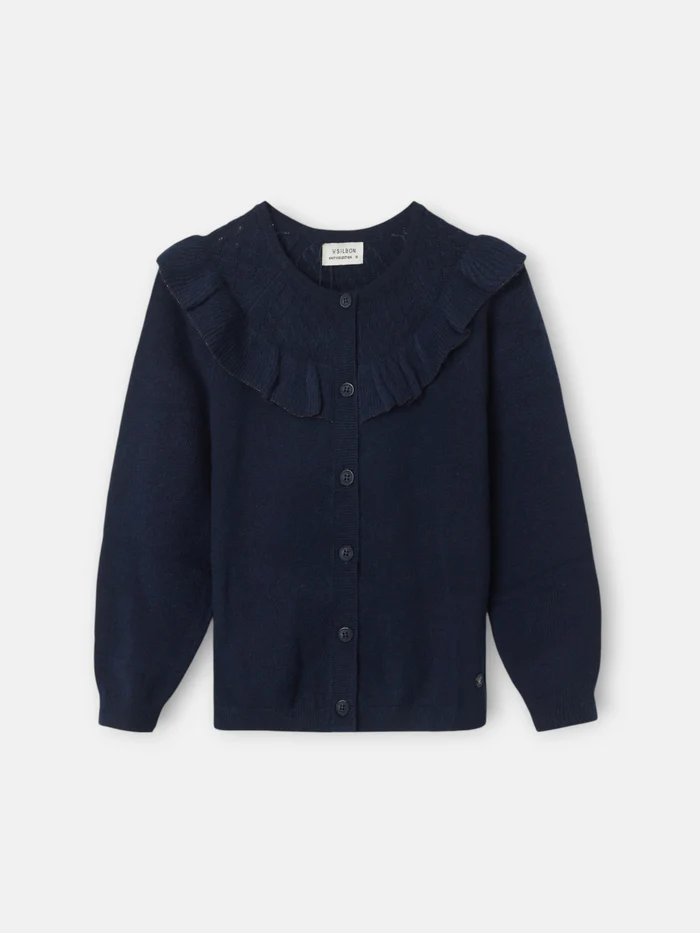 El cárdigan de punto azul marino es una prenda versátil y atemporal, confeccionada en una suave mezcla de lana que ofrece calidez y comodidad durante todo el día. Su diseño combina estilo clásico con un toque femenino, gracias al cuello redondo, el cierre delantero con botones dorados y los volantes en los hombros que aportan un aire delicado y sofisticado.