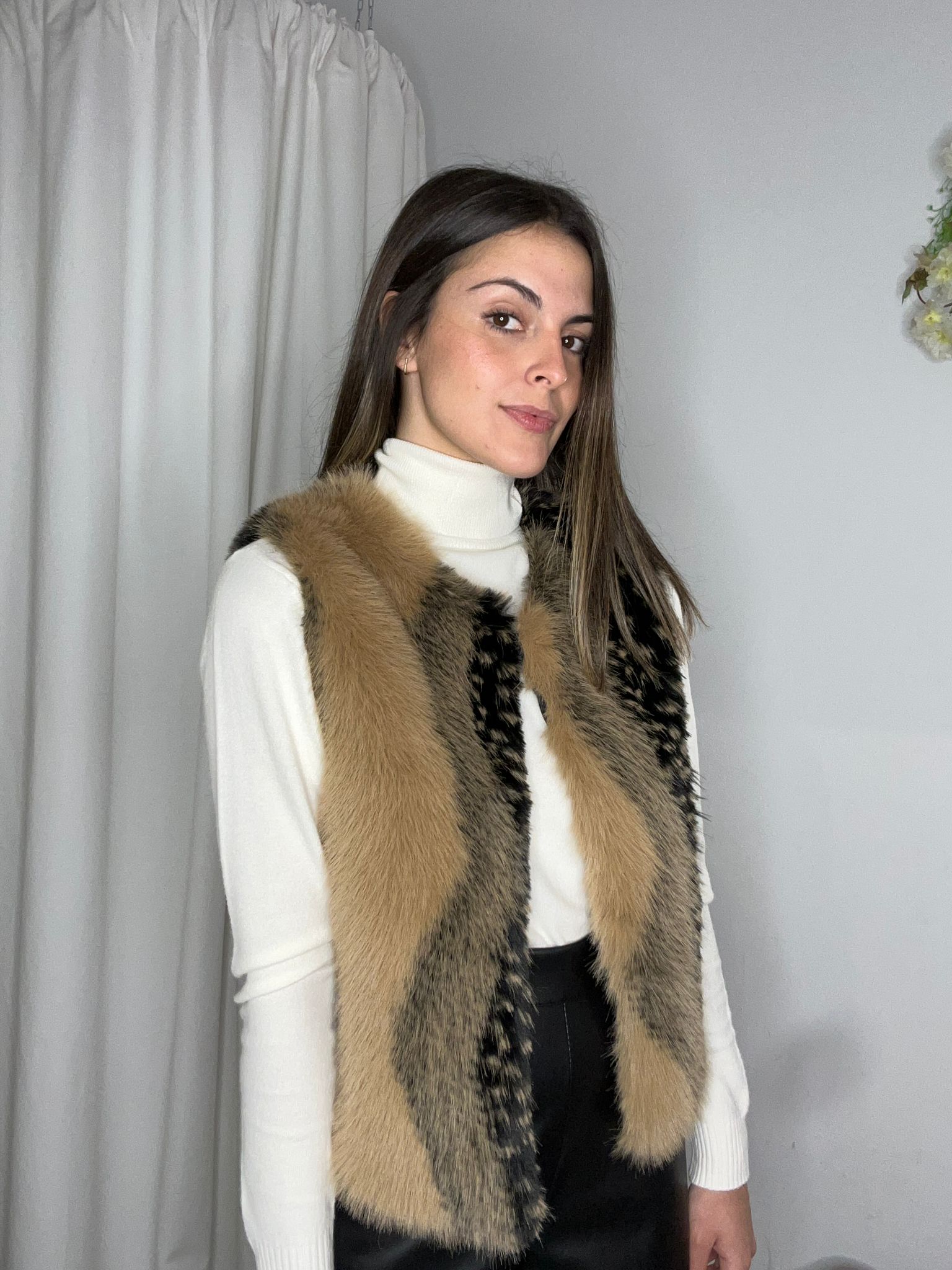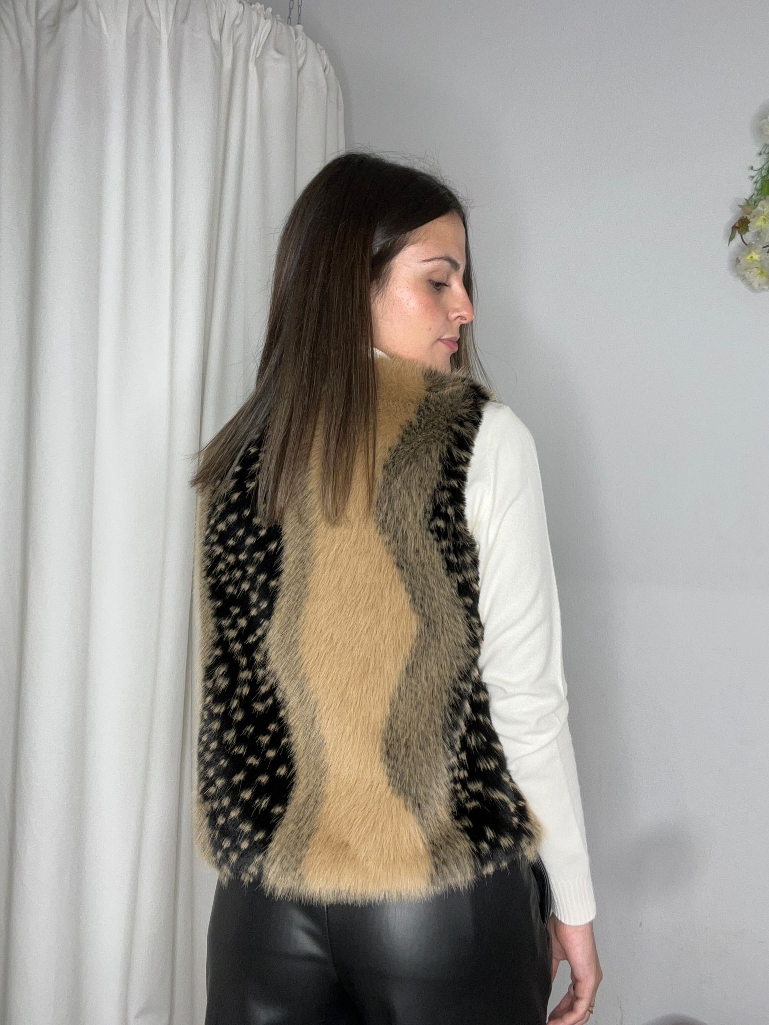 Chaleco de pelo sintético bicolor en tonos beige y negro con diseño de inspiración animal print.