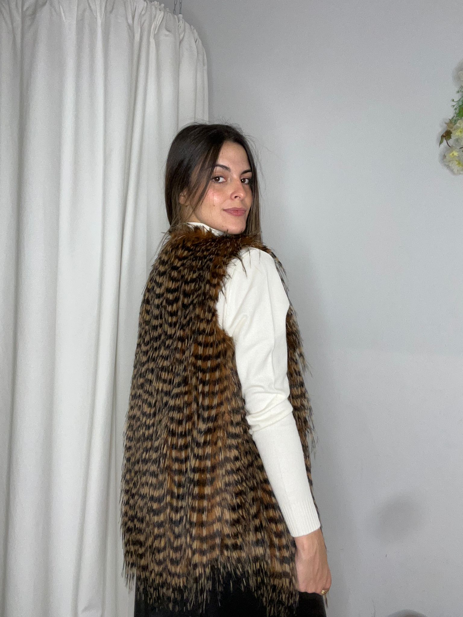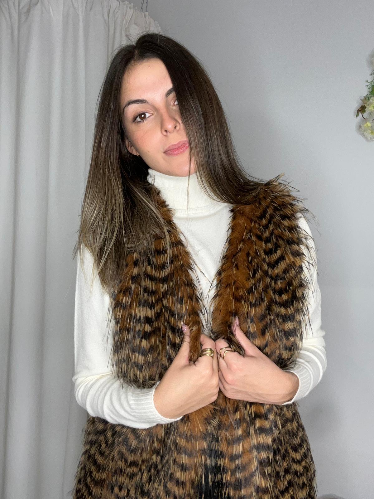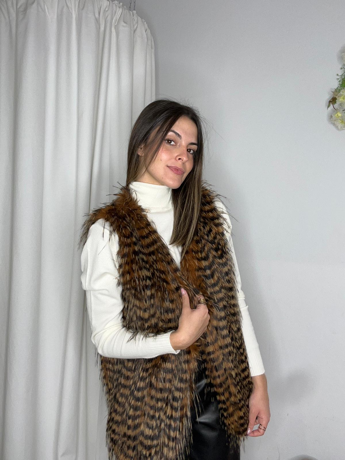 Chaleco de pelo sintético con estampado animal en tonos marrones, una prenda sofisticada que aporta calidez y estilo a cualquier look.