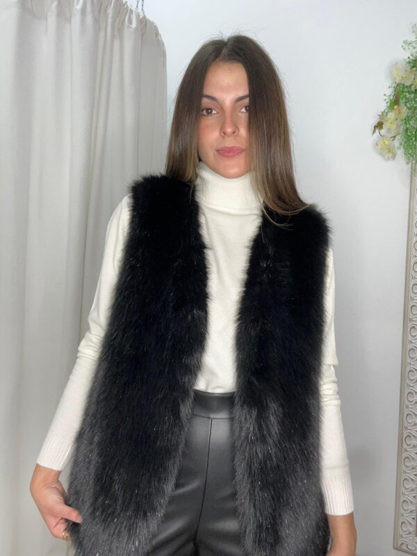 Chaleco de pelo sintético negro, una prenda elegante y versátil ideal para elevar cualquier look de temporada.