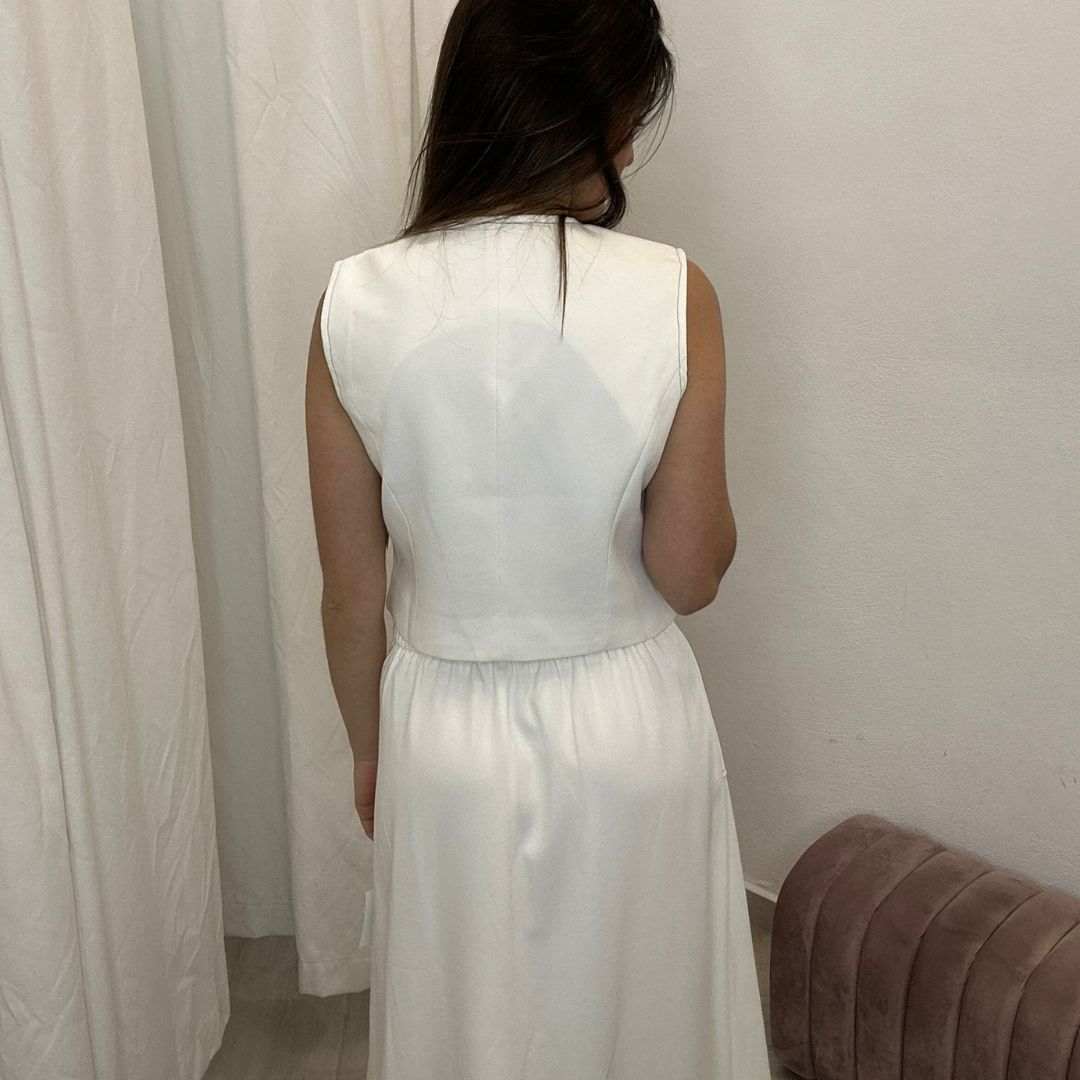 Este chaleco ha sido creado para formar el «total white look» definitivo al combinarlo con nuestra falda midi a juego (visible en la imagen). Esta combinación monocromática es una apuesta segura por la sofisticación absoluta, ideal para invitadas que buscan salirse de lo convencional con un set de dos piezas coordinado.