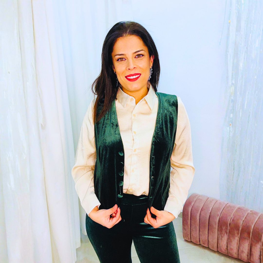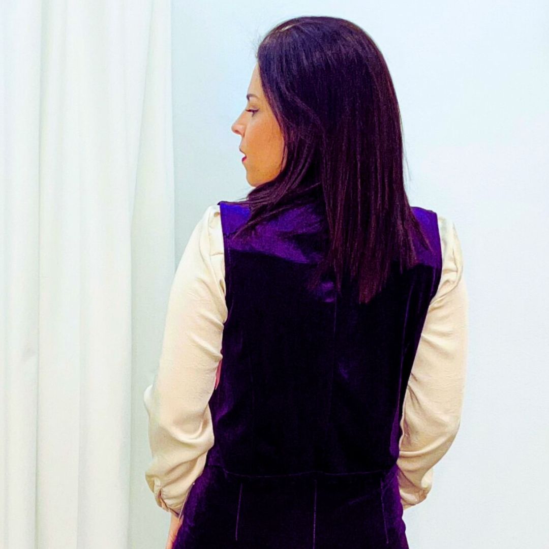 Chaleco confeccionado en terciopelo suave, disponible en dos tonos elegantes: verde y lila.