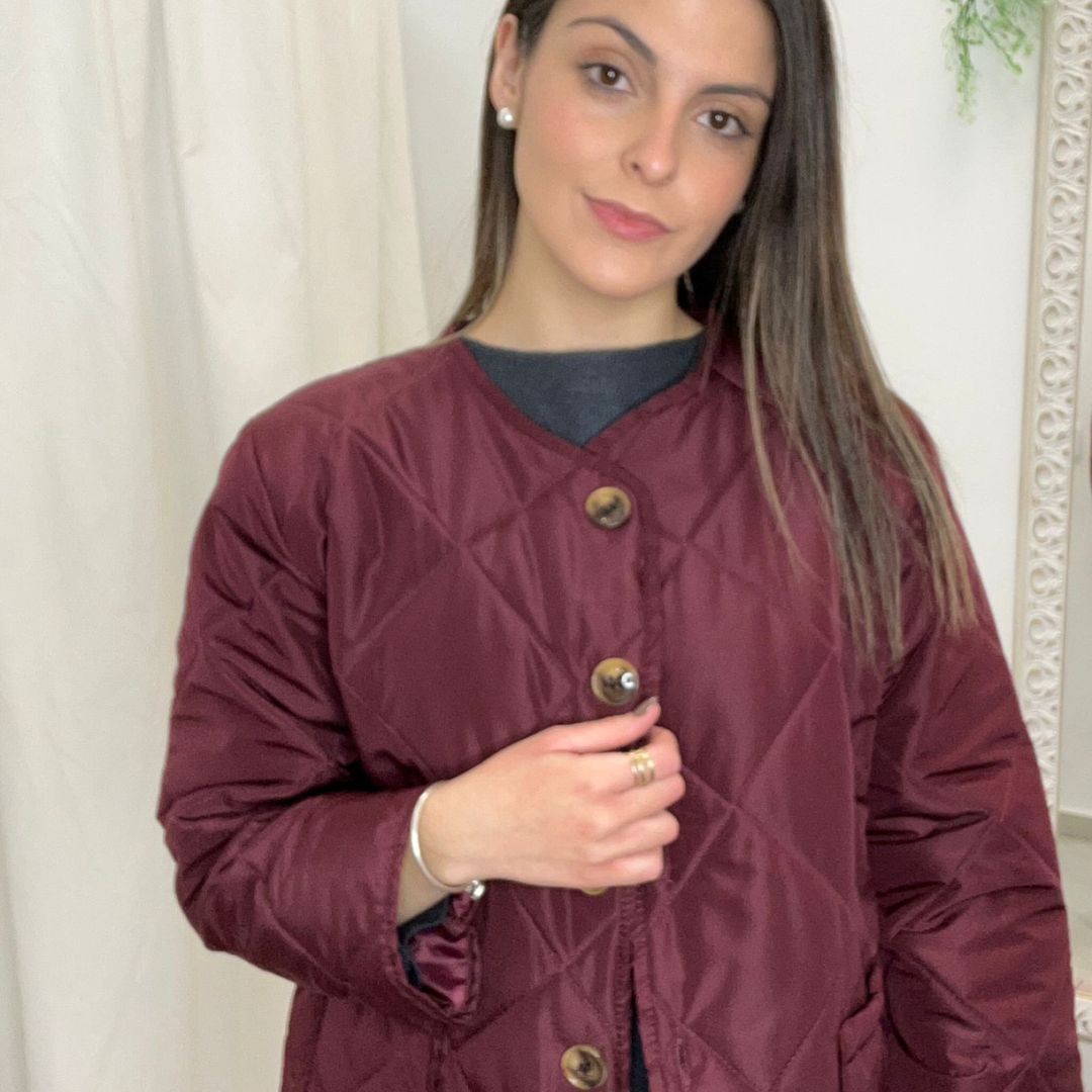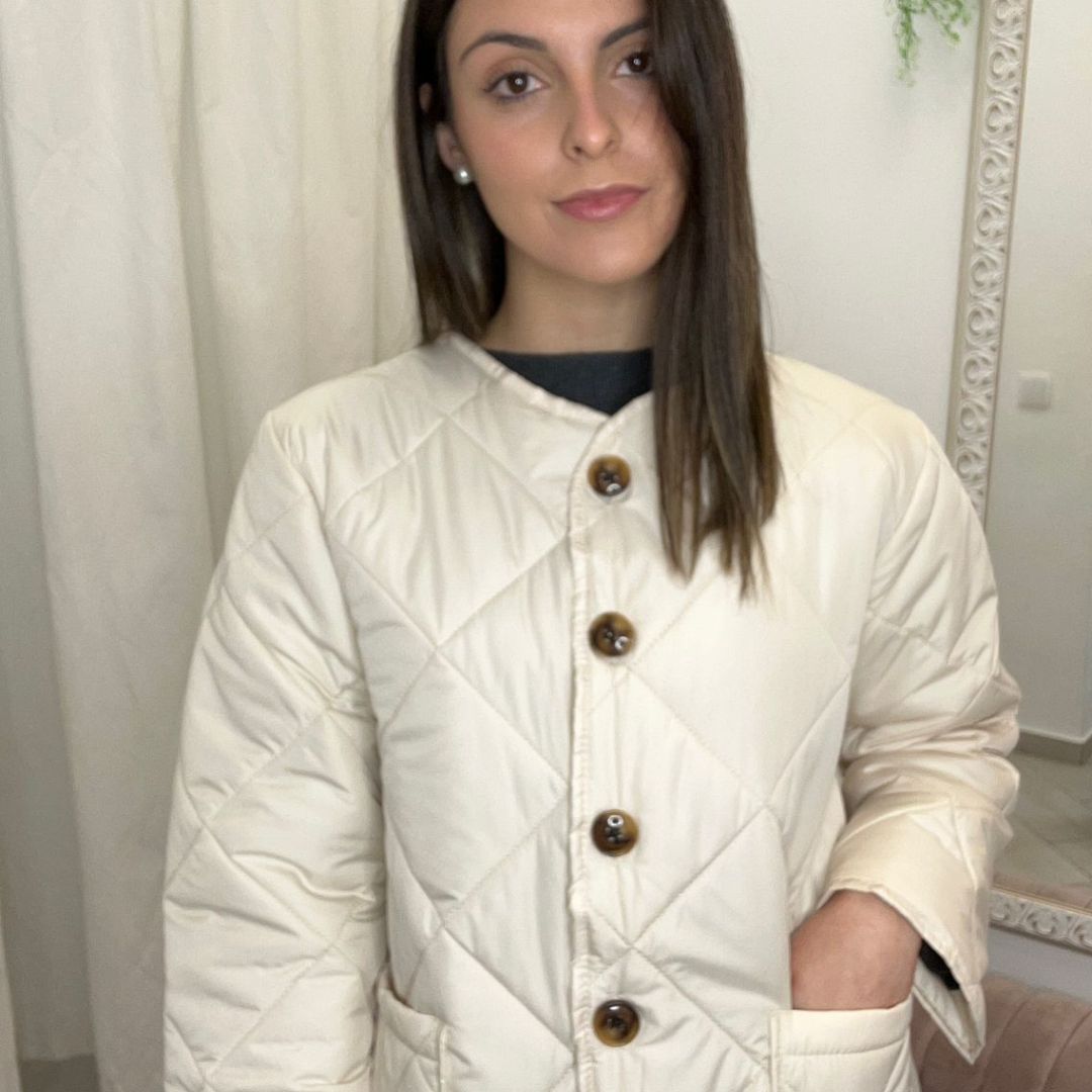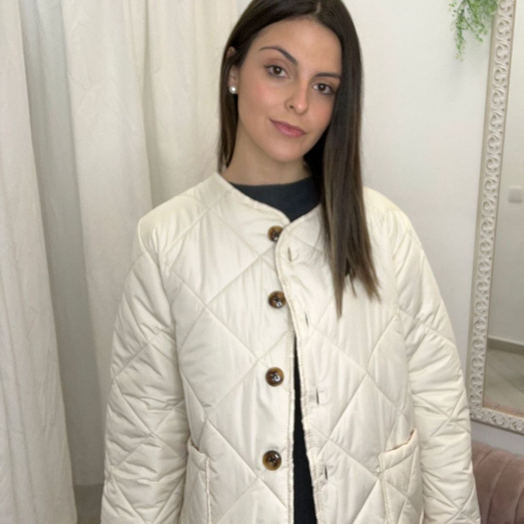 Chaqueta corta acolchada de diseño limpio y actual. Confeccionada con relleno ligero que aporta abrigo sin volumen, presenta cuello a la caja sin solapa para un acabado minimalista y fácil de combinar. El cierre frontal con botones le da un toque clásico y práctico, mientras que los bolsillos delanteros añaden funcionalidad y comodidad para el día a día. Su largo corto realza la silueta y la convierte en una prenda versátil, ideal para looks casuales o urbanos en entretiempo y días frescos.