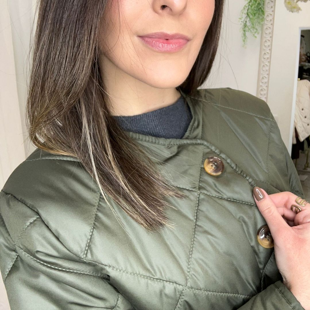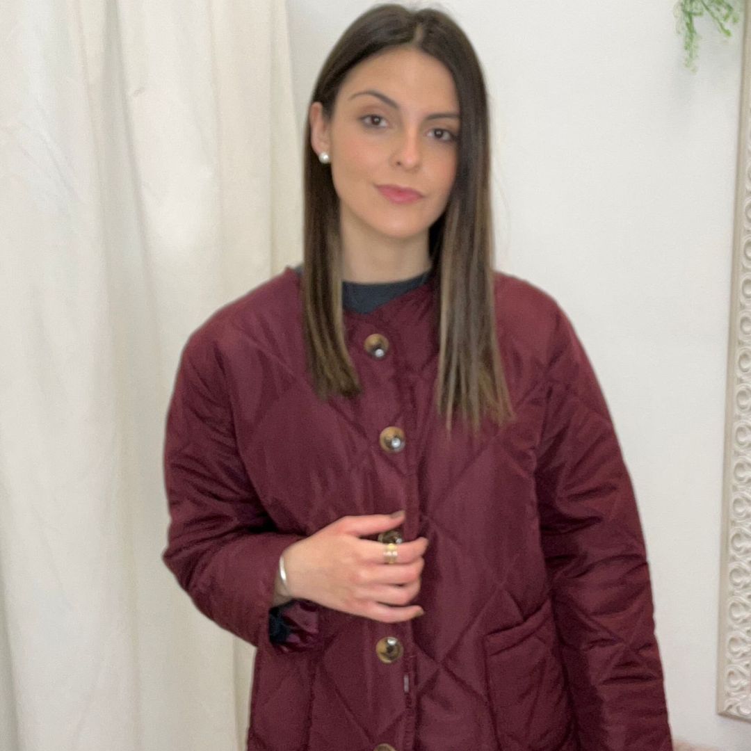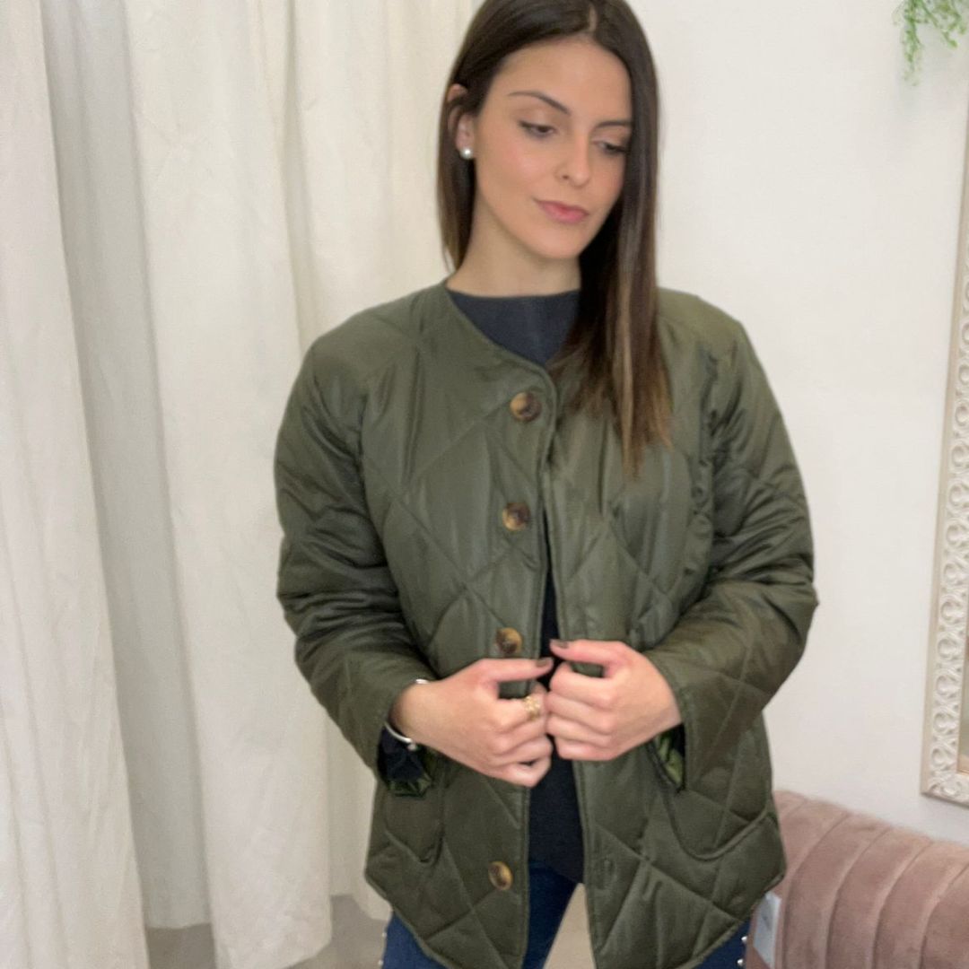 Chaqueta corta acolchada de diseño limpio y actual. Confeccionada con relleno ligero que aporta abrigo sin volumen, presenta cuello a la caja sin solapa para un acabado minimalista y fácil de combinar. El cierre frontal con botones le da un toque clásico y práctico, mientras que los bolsillos delanteros añaden funcionalidad y comodidad para el día a día. Su largo corto realza la silueta y la convierte en una prenda versátil, ideal para looks casuales o urbanos en entretiempo y días frescos.