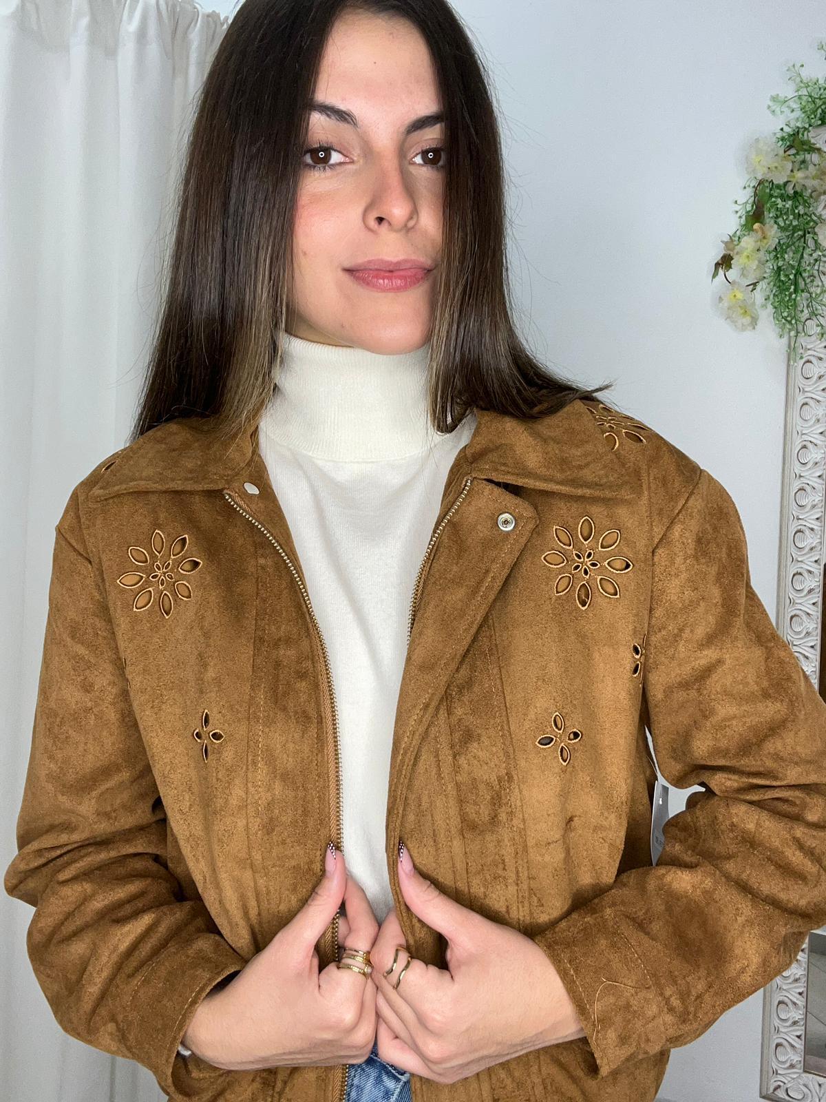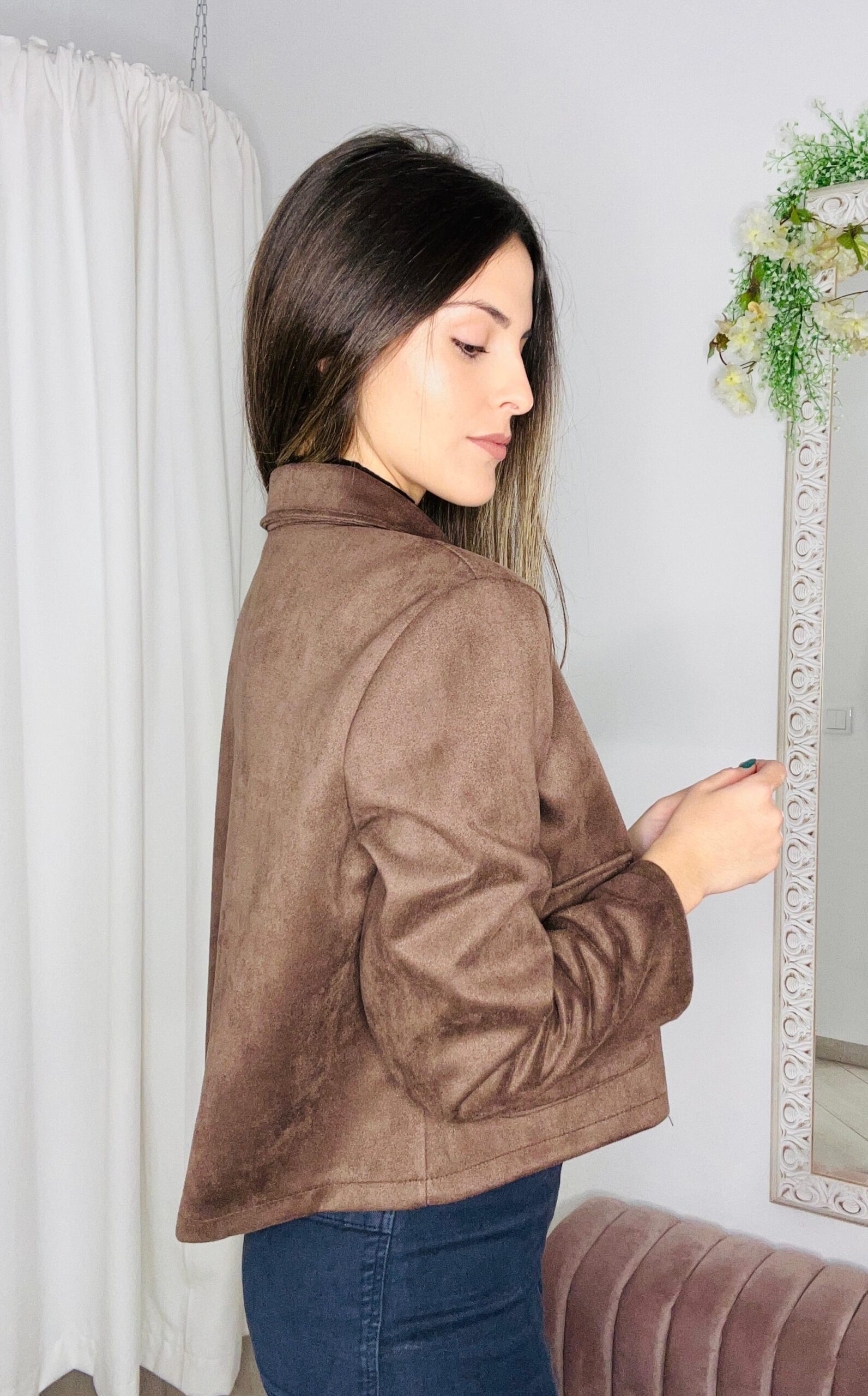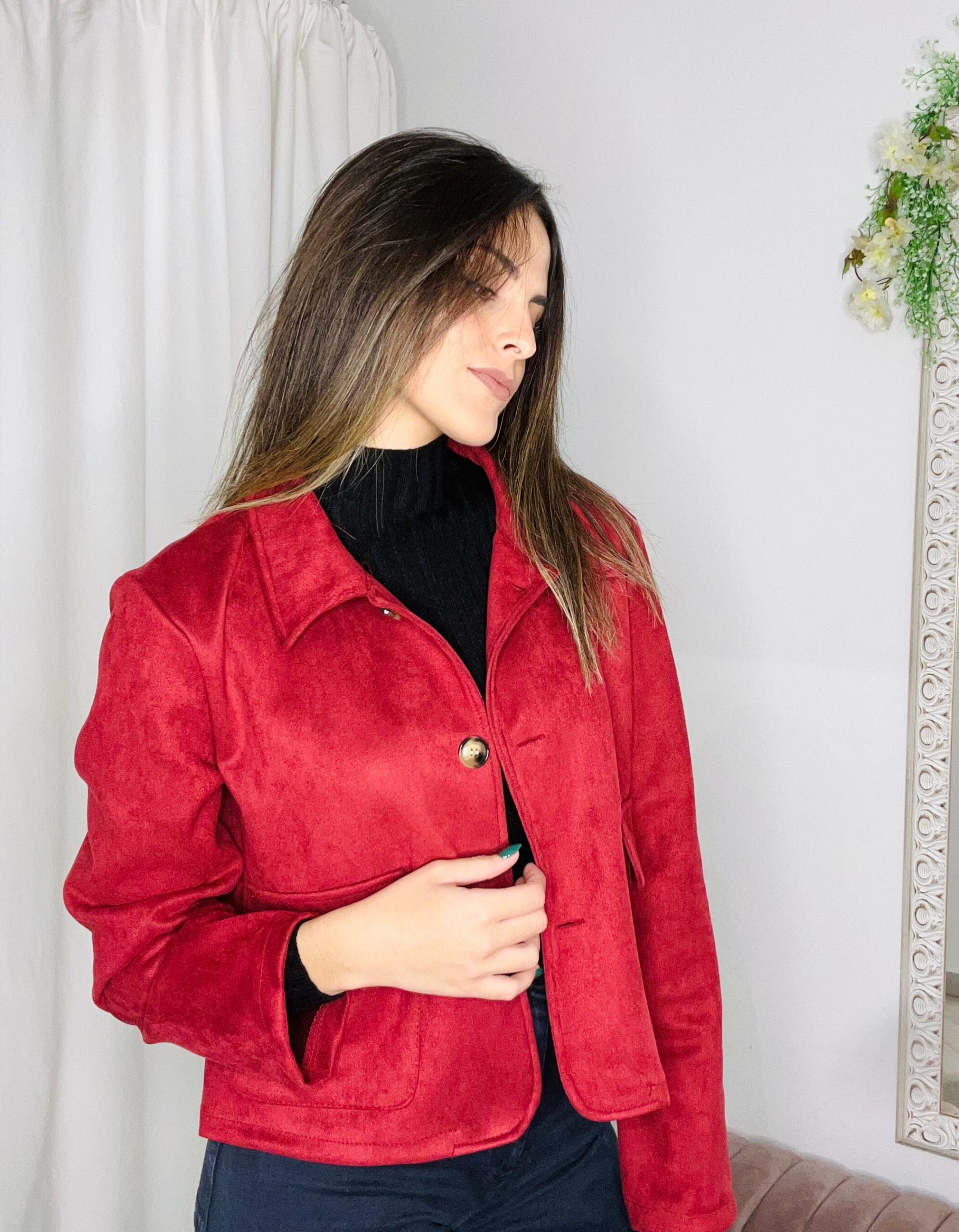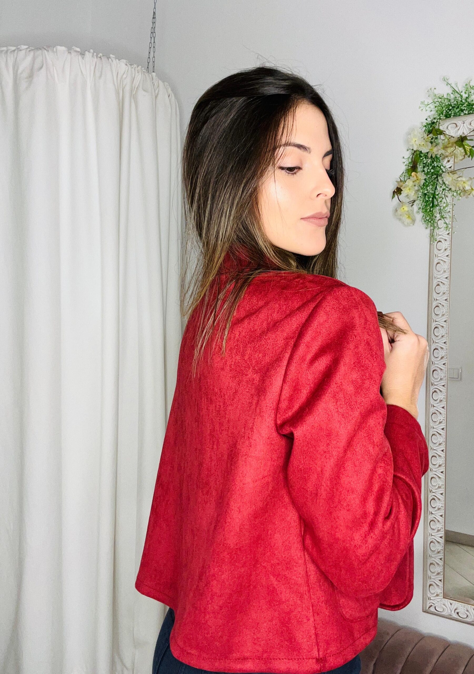 Chaqueta corta de mujer confeccionada en antelina suave, disponible en varios colores elegantes-rojo, verde y marrón-.