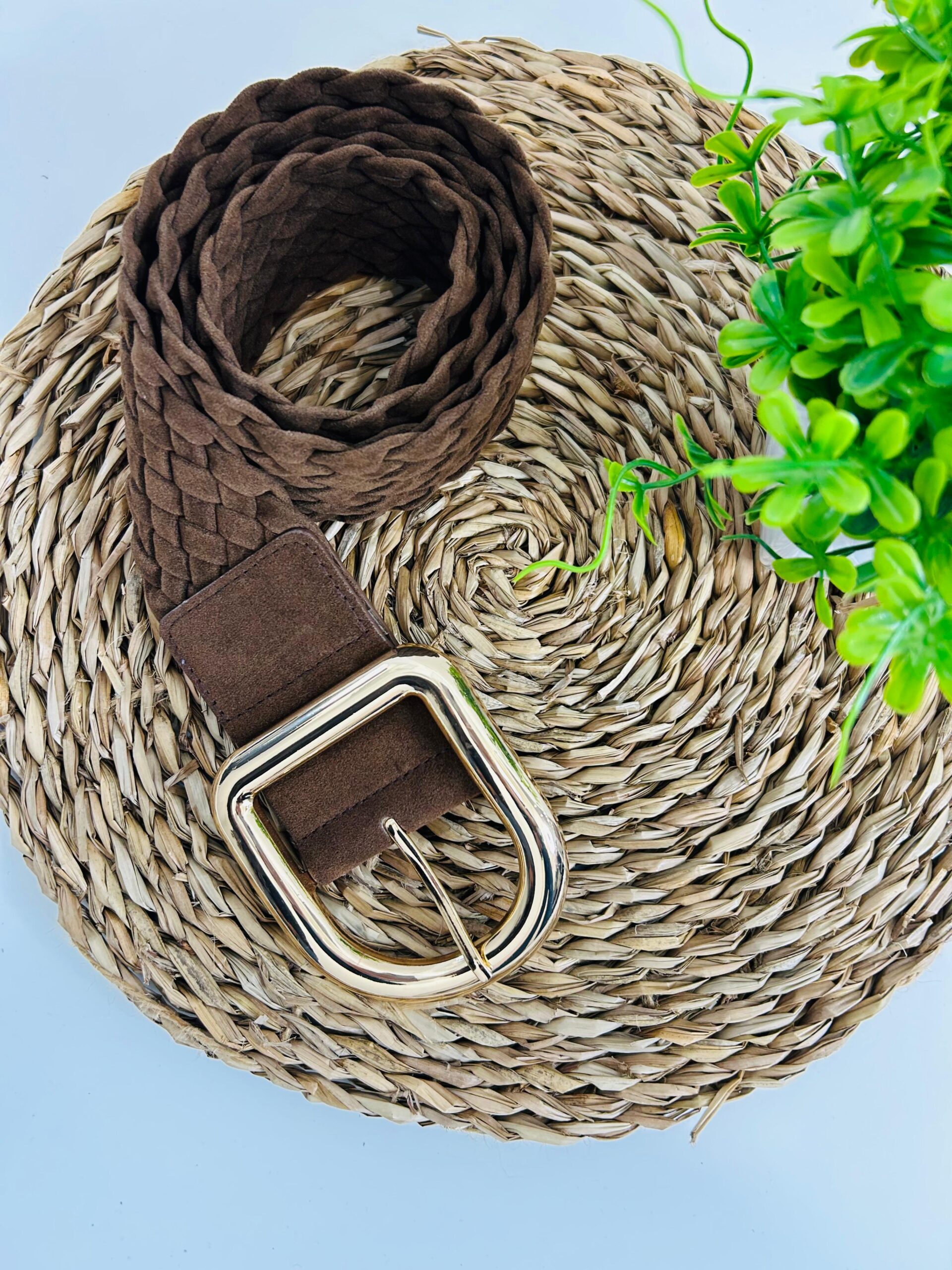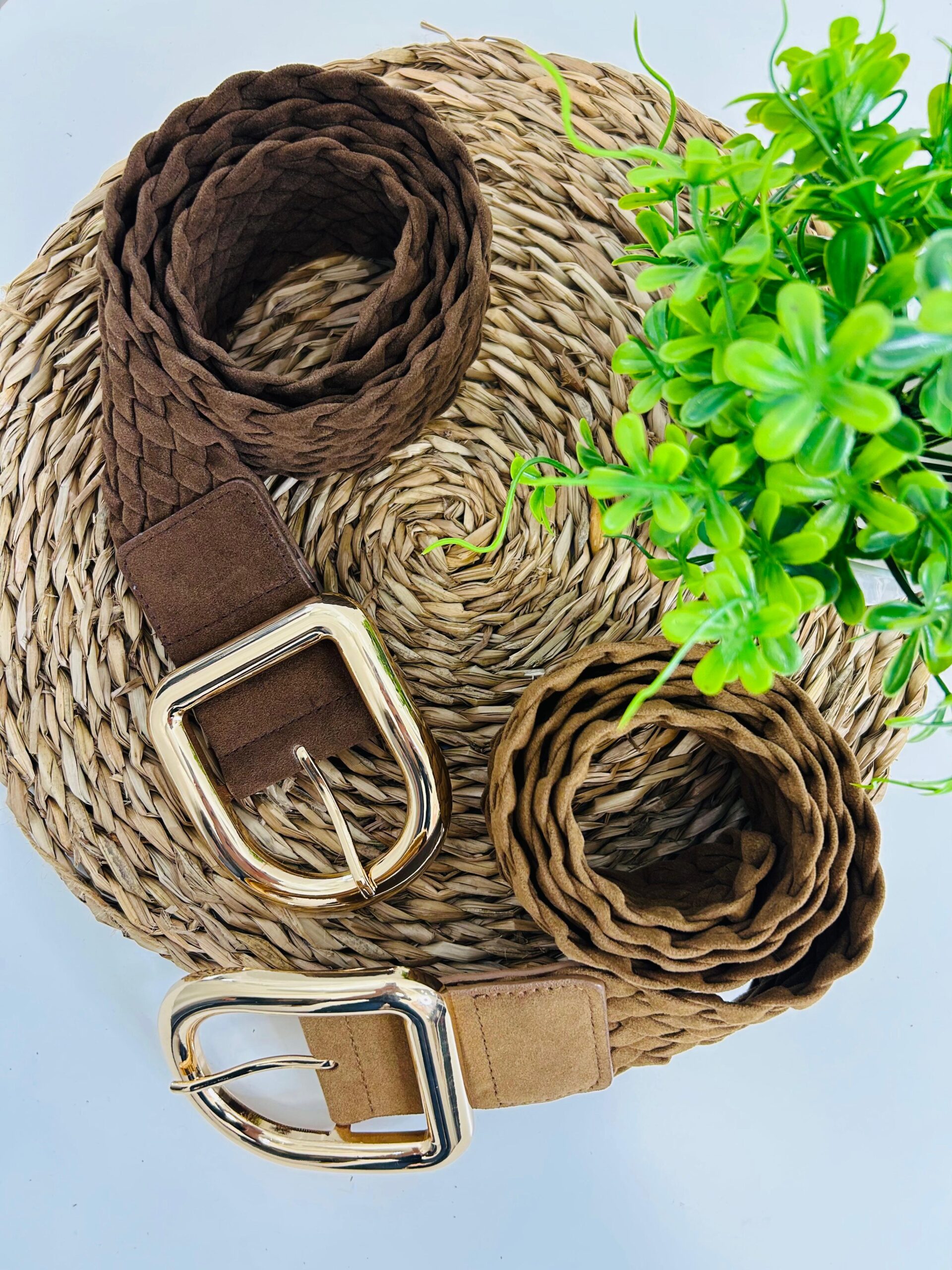 Su diseño trenzado en tonos tierra –marrón chocolate y camel– y la hebilla metálica dorada crean un acabado sofisticado que realza desde vestidos hasta pantalones y prendas oversize.