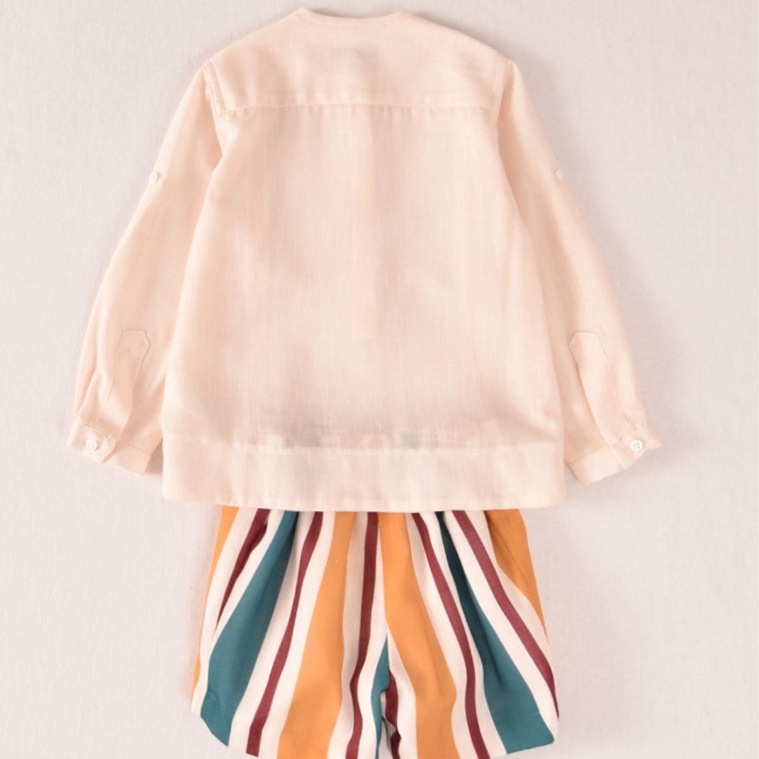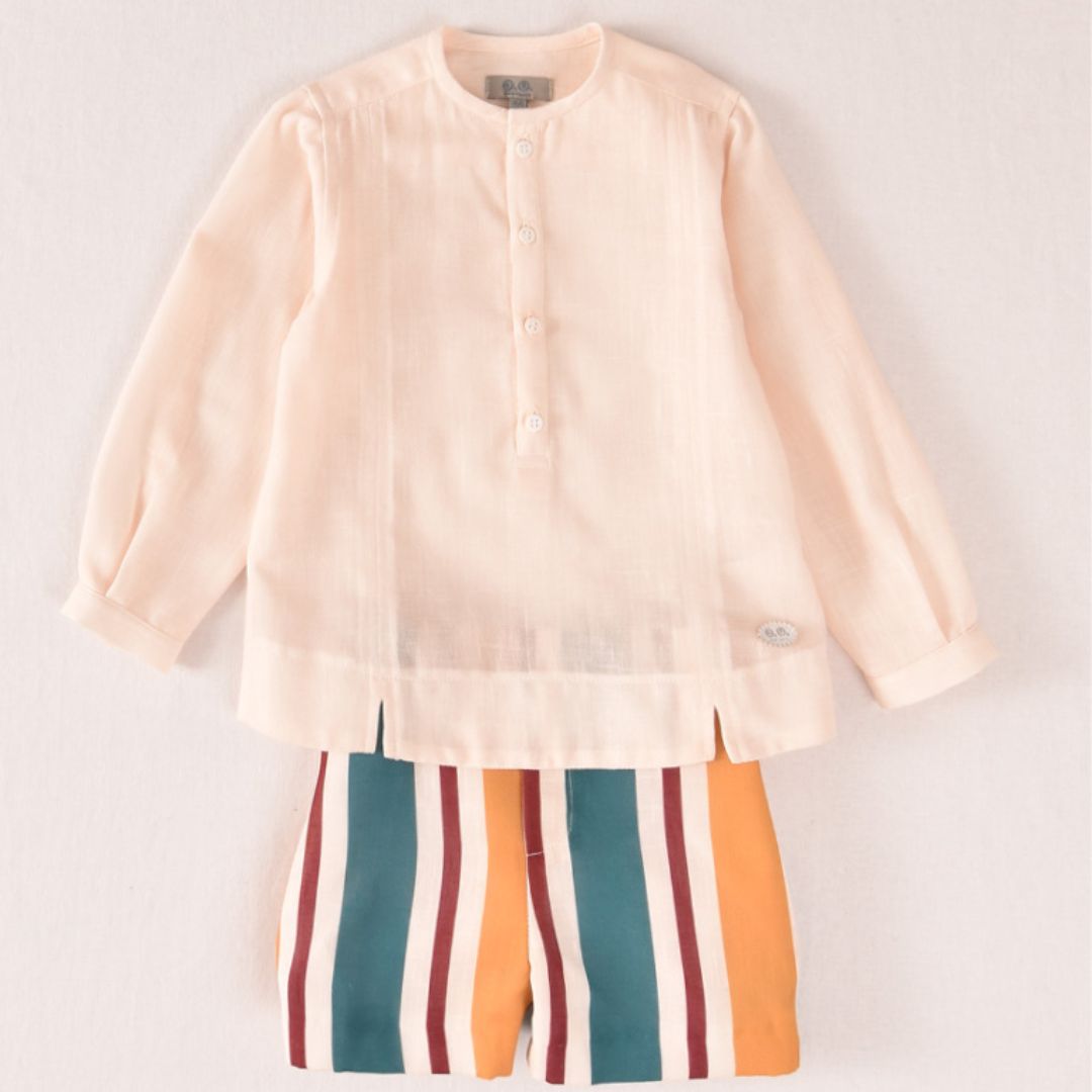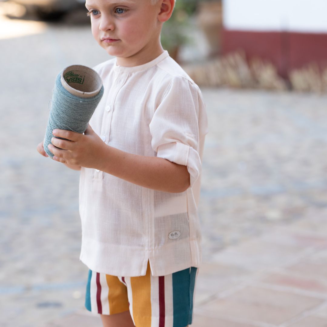 Viste a tu pequeño con la frescura y el colorido del verano mediterráneo. Este conjunto de la Familia Rayas de José Varón es una apuesta segura por la comodidad sin renunciar al estilo artesanal que caracteriza a la firma. Un set equilibrado que combina una prenda superior neutra con un pantalón lleno de personalidad.