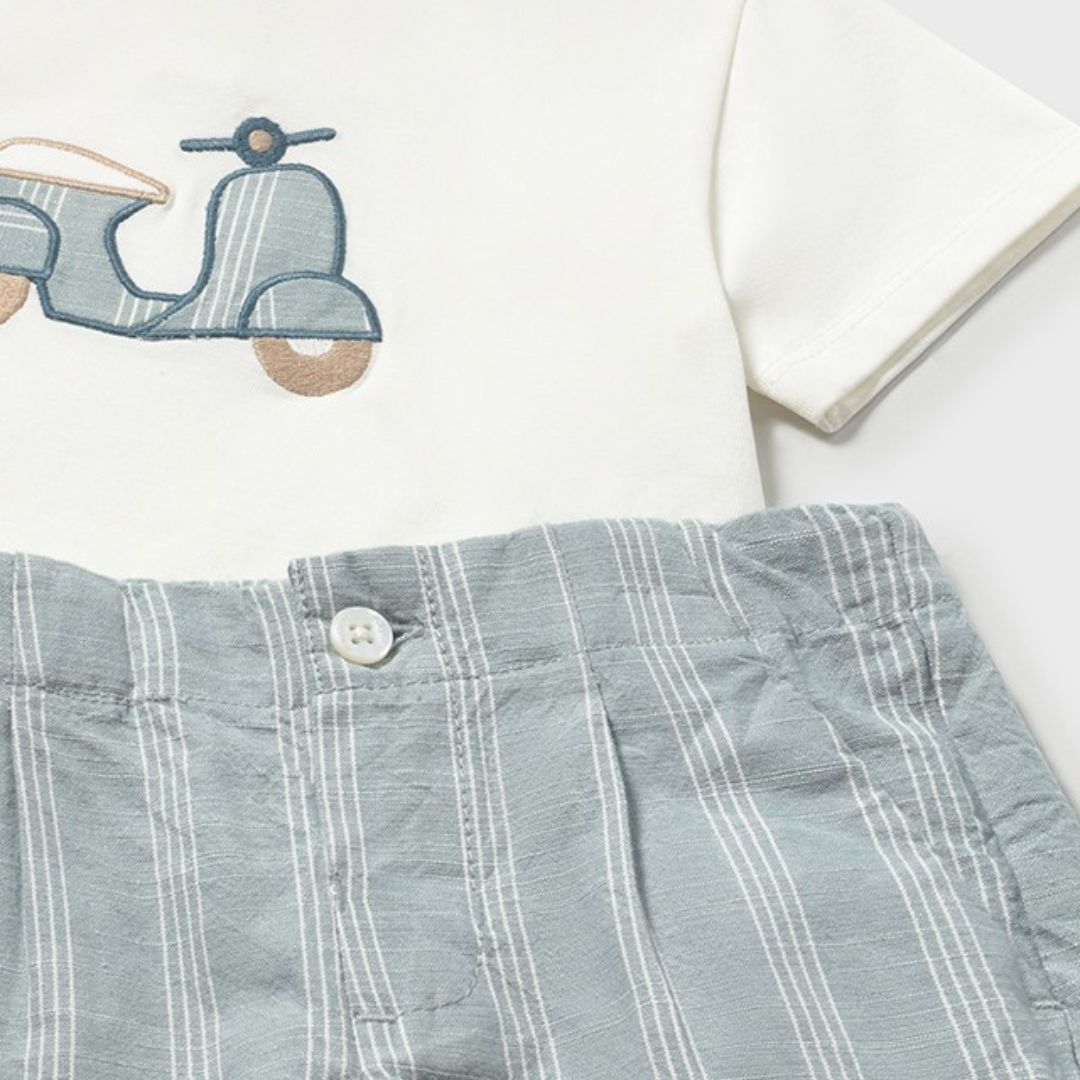 Estilo Coordinado: El diseño de rayas de la scooter en la camiseta combina perfectamente con el tejido del pantalón, creando un look armonioso y cuidado.