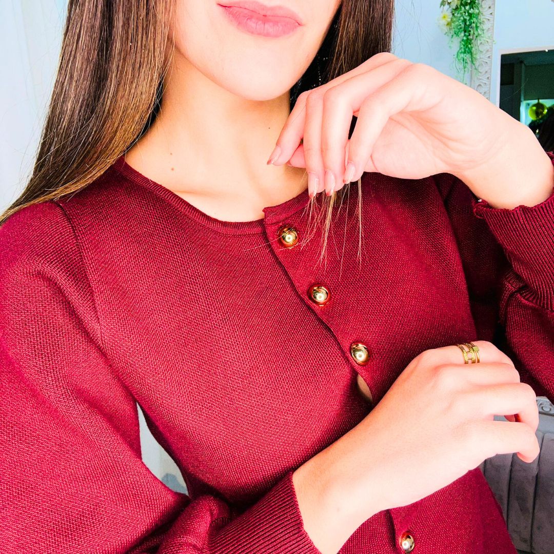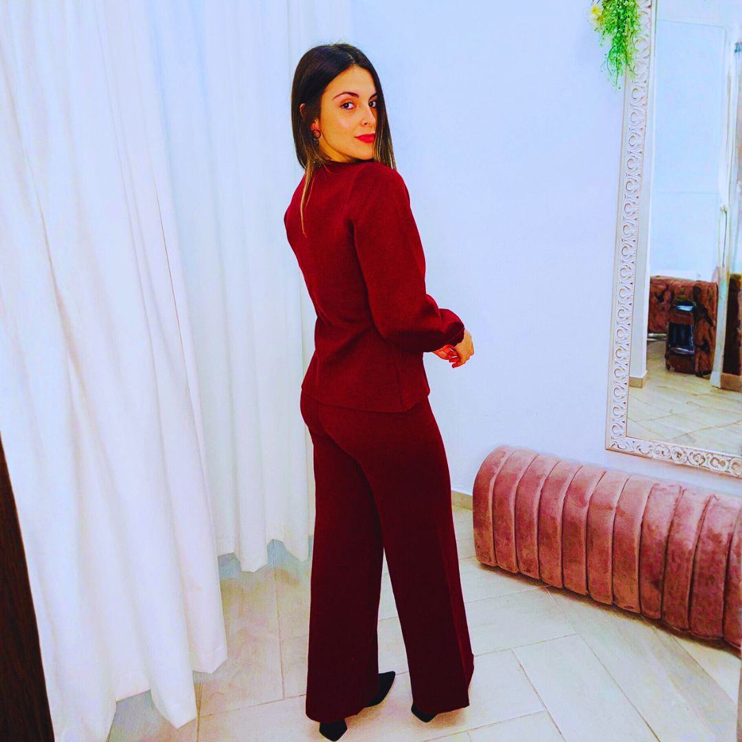 Conjunto de punto en color burdeos, perfecto para lucir cómodo y elegante en cualquier ocasión.