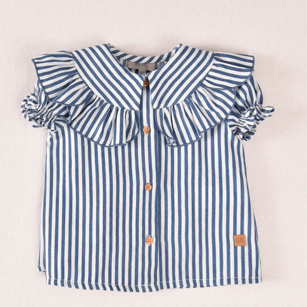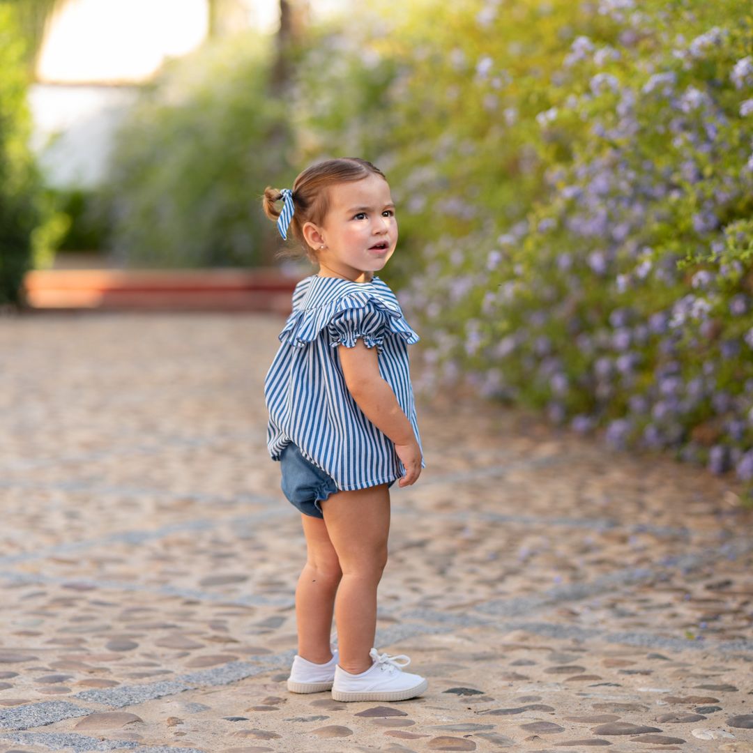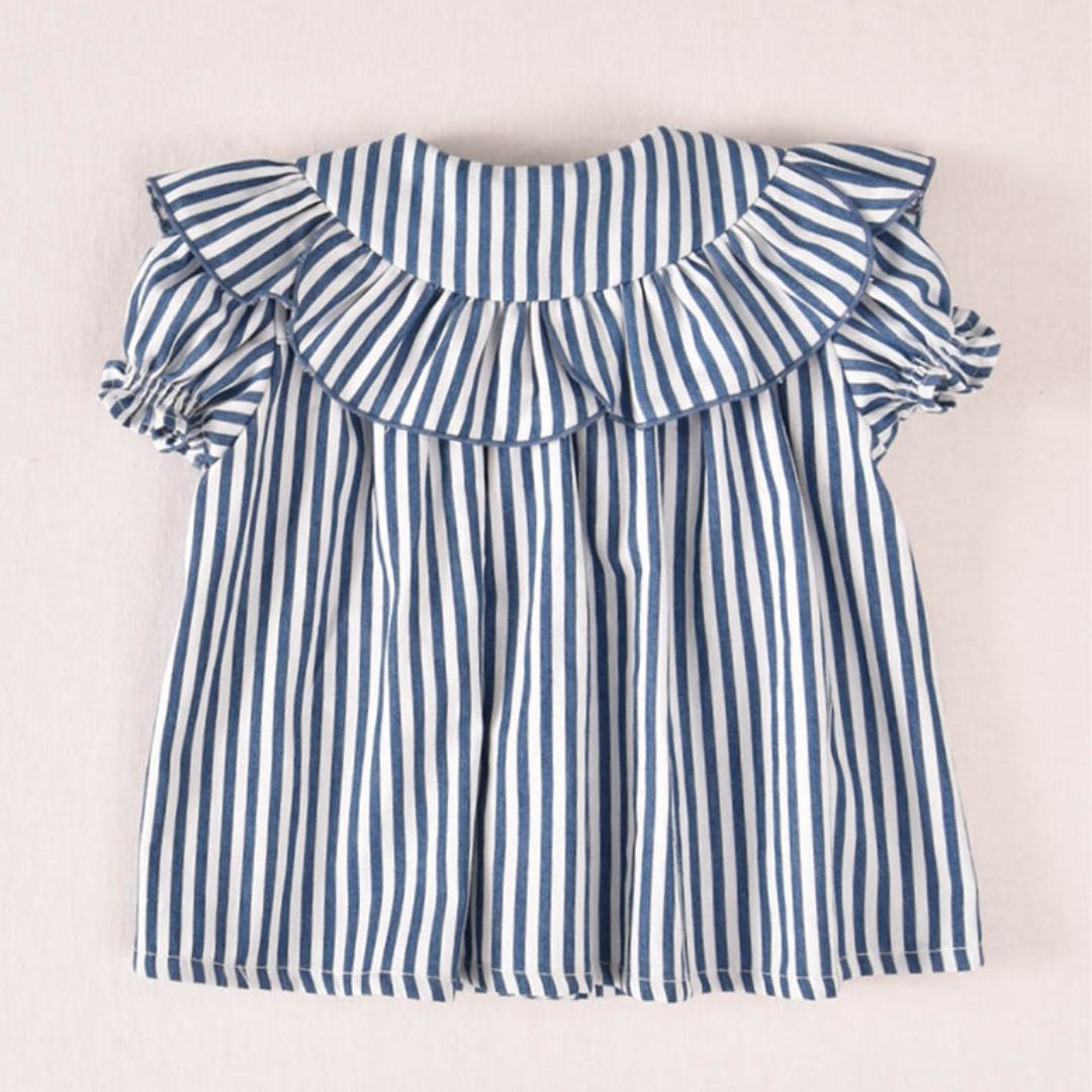 Blusa de Rayas Náuticas: Confeccionada en un tejido ligero con estampado de rayas verticales en azul y blanco. Destaca por su maxi volante sobre los hombros y cuello, aportando volumen y un estilo muy chic.