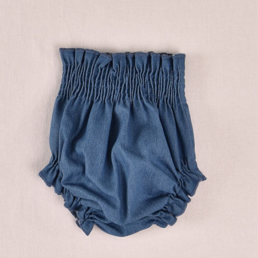 Bombacho en Tejido Denim: El conjunto se completa con un cubrepañal tipo bombacho en color azul denim, con gomas suaves en las perneras para garantizar el máximo confort y libertad de movimiento.