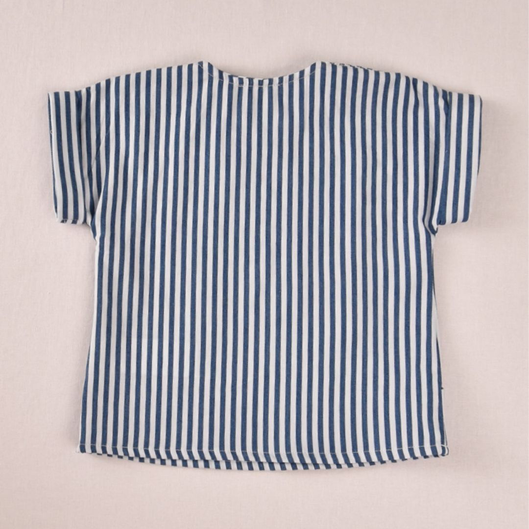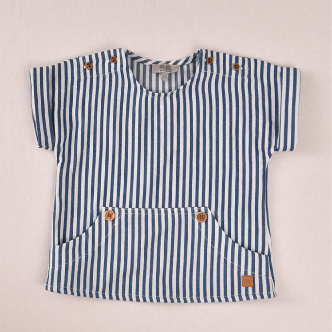 Camiseta Estampada: Confeccionada en un suave tejido de rayas verticales en azul denim y blanco. Presenta un práctico bolsillo canguro frontal y una apertura de botones de madera en ambos hombros para facilitar el cambio de ropa.