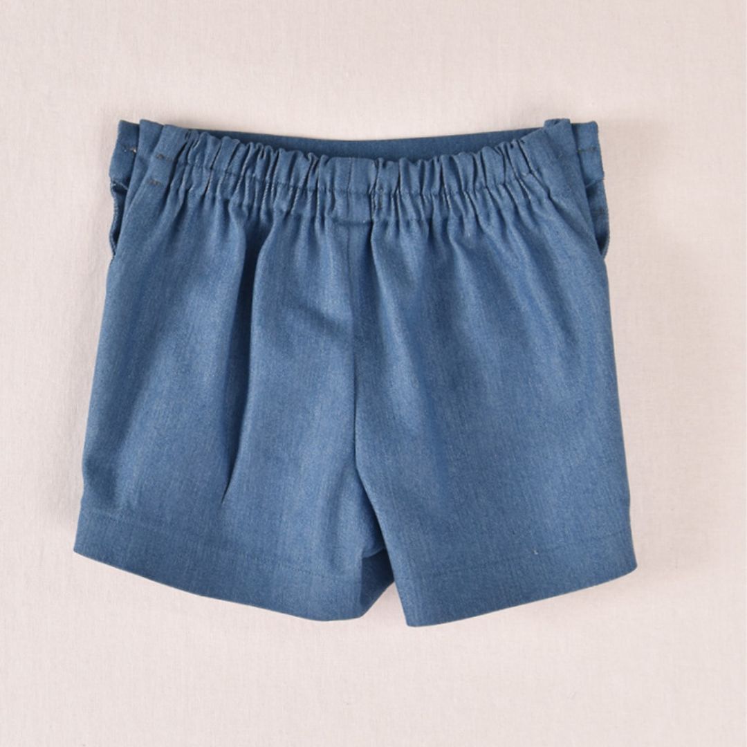 Pantalón Short Denim: Un pantalón corto en tejido tipo denim de alta calidad, diseñado con una cintura cómoda y detalles de botones de madera en los laterales.