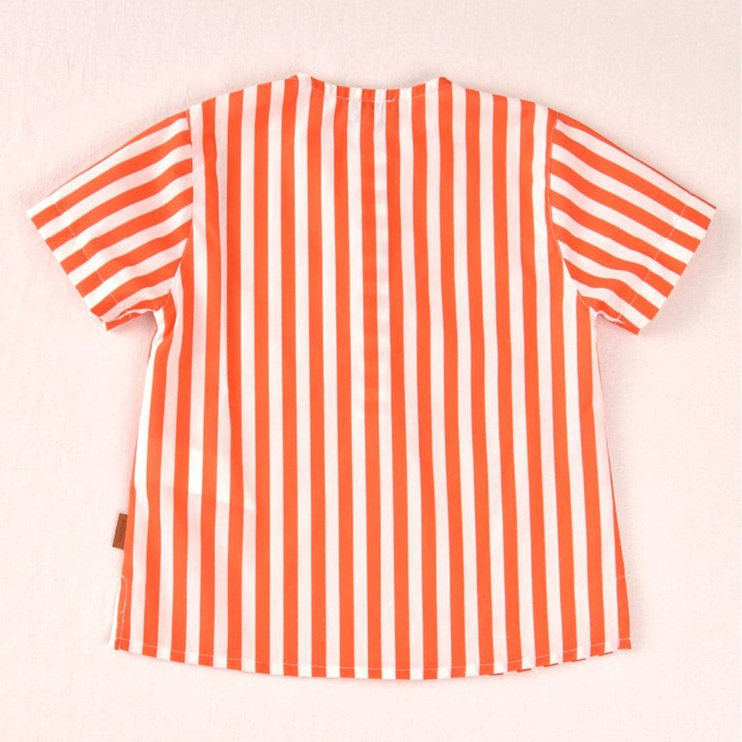Camisa/Blusón de Rayas: Presenta un clásico estampado de rayas verticales en color coral y blanco. Dependiendo del modelo (niño o niña), incluye detalles como cuello mao con botones frontales o mangas con volante que aportan un aire dulce y desenfrenado.