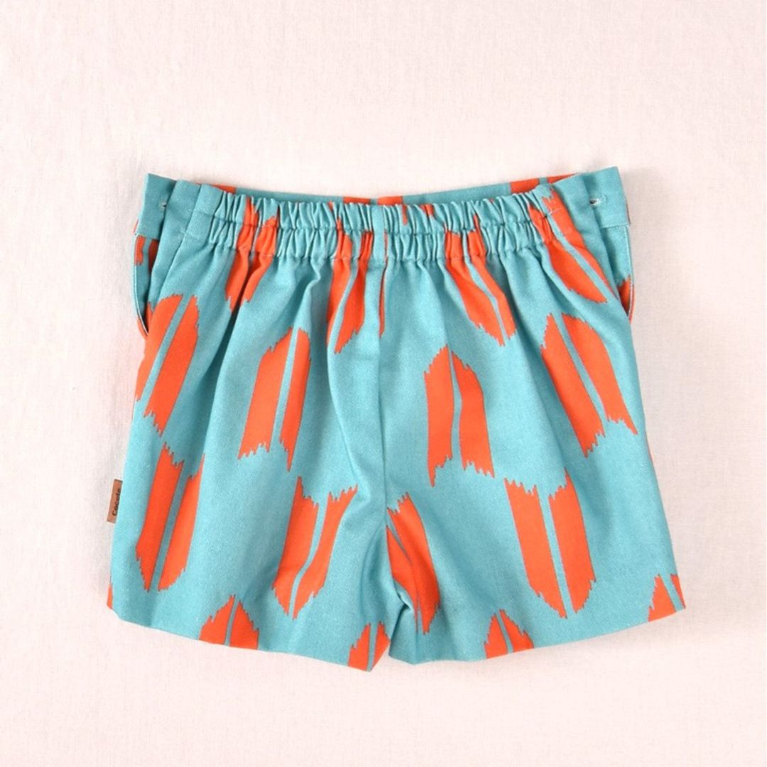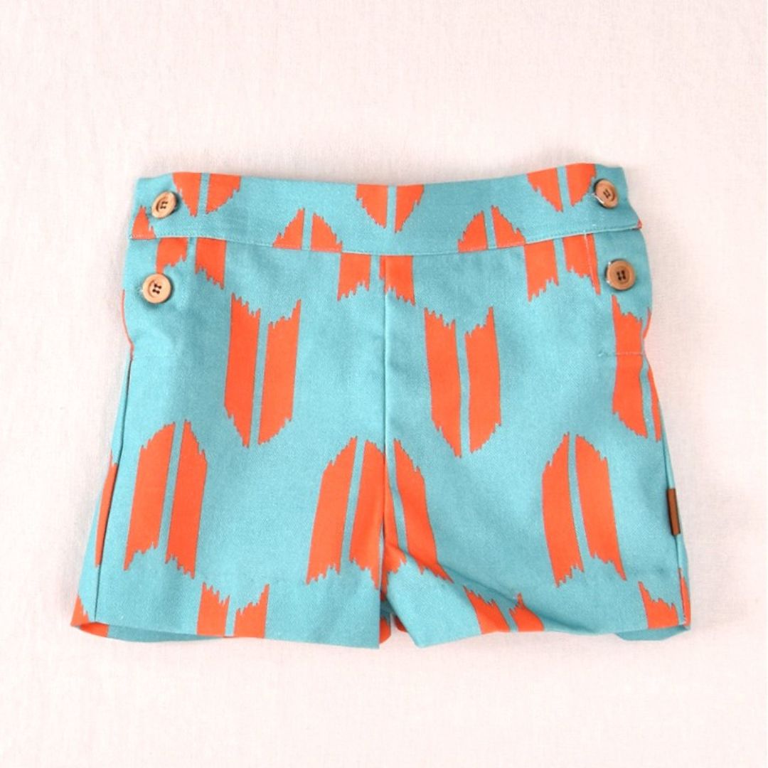 Pantalón/Short de Contraste: La parte inferior destaca en un refrescante tono azul turquesa. Cuenta con detalles geométricos en coral que rompen con la sencillez, y en la versión para niña, un original bajo rematado con volante plisado.