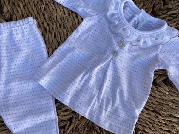 Conjunto jubón y polaina para bebé unisex. Tejido de algodón suave. Estampado de topitos grises sobre fondo blanco. se abrocha mediante botones a presión.