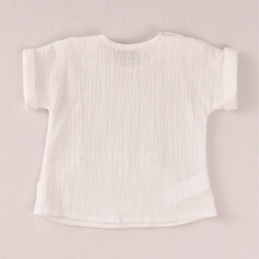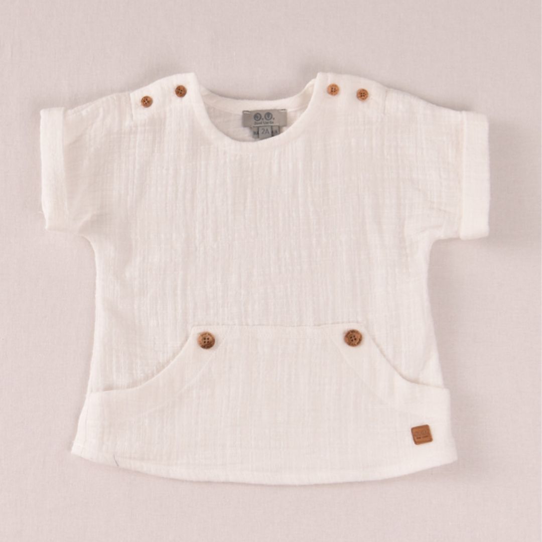 Camiseta de Gasa Blanca: Confeccionada en un tejido de gasa ligera con una textura sutil muy fresca. Presenta botones de madera en los hombros para facilitar el puesto y un práctico bolsillo frontal tipo canguro adornado con la misma botonería orgánica.