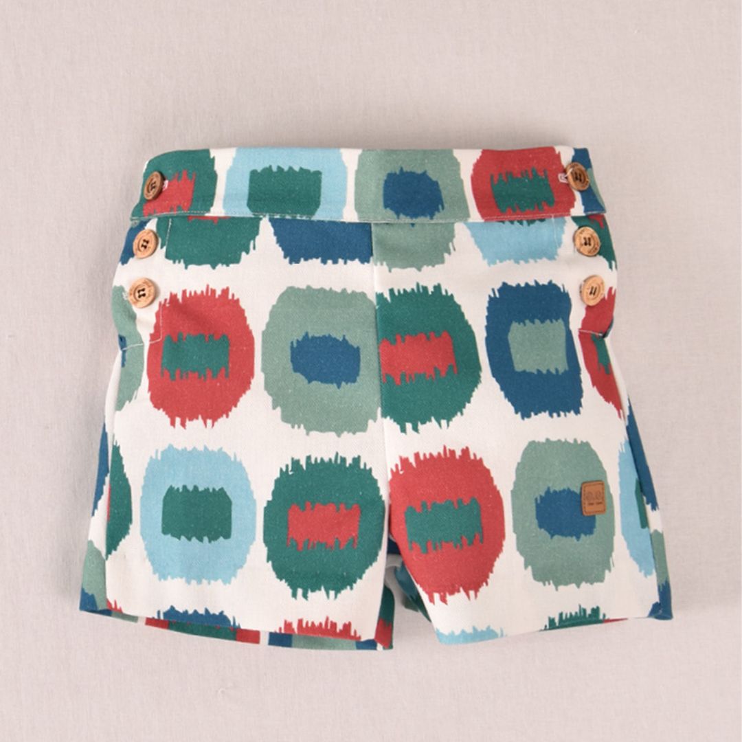 Pantalón Short Artístico: El protagonista es el pantalón corto con un estampado de manchas o círculos abstractos en tonos buganvilla, turquesa, mostaza y verde carruaje.