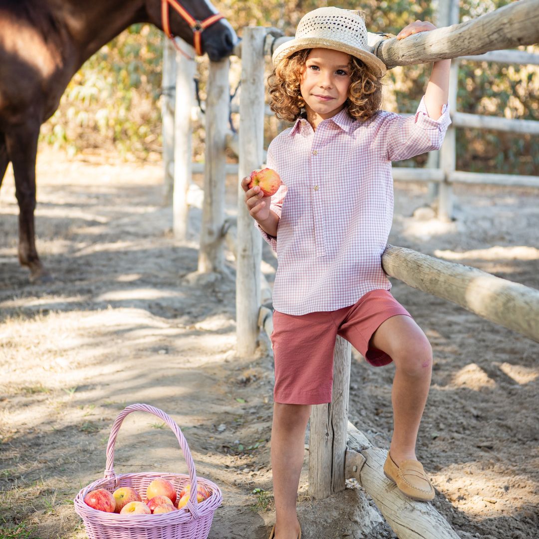 Camisa de Cuadros Vichy: Una prenda de manga larga confeccionada en un suave cuadro vichy en tonos coral y blanco. Destaca por su cuello clásico y su pechera con botones de madera, además de contar con prácticos botones en las mangas para un estilo más informal remangado.