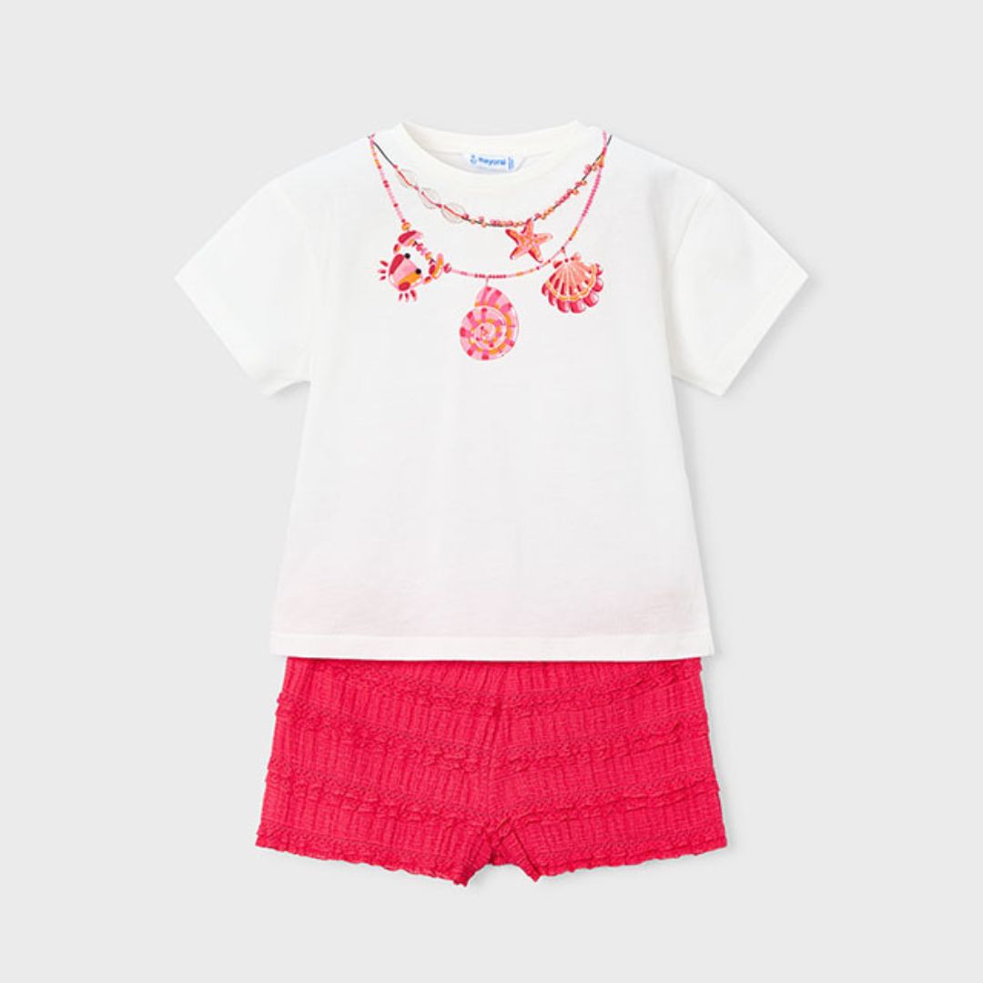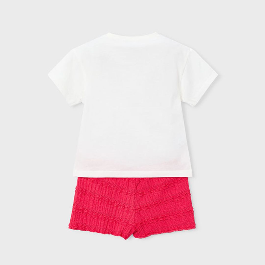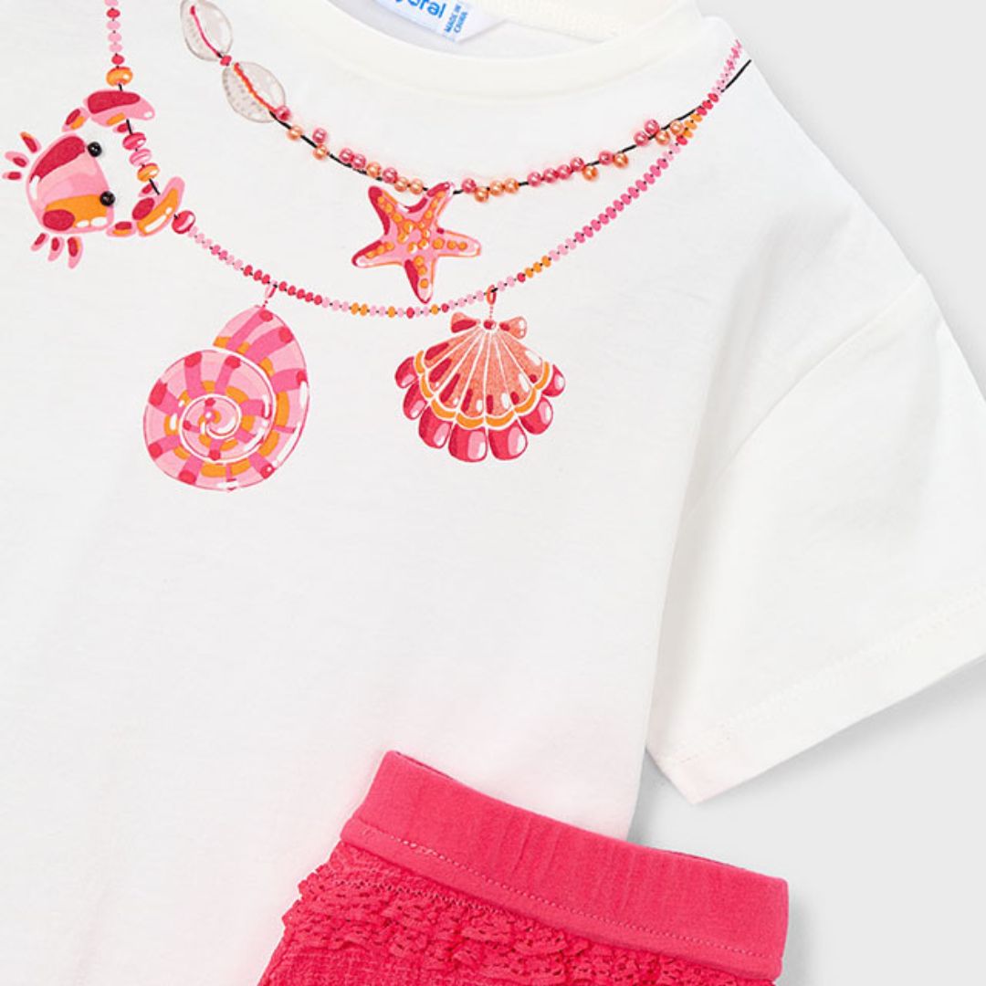 Este conjunto de dos piezas de la prestigiosa marca Mayoral es la elección perfecta para que las más pequeñas disfruten del verano con frescura, comodidad y un estilo encantador. Diseñado con una vibrante combinación de blanco y fucsia, este conjunto destaca por su calidad y detalles cuidadosamente elaborados.