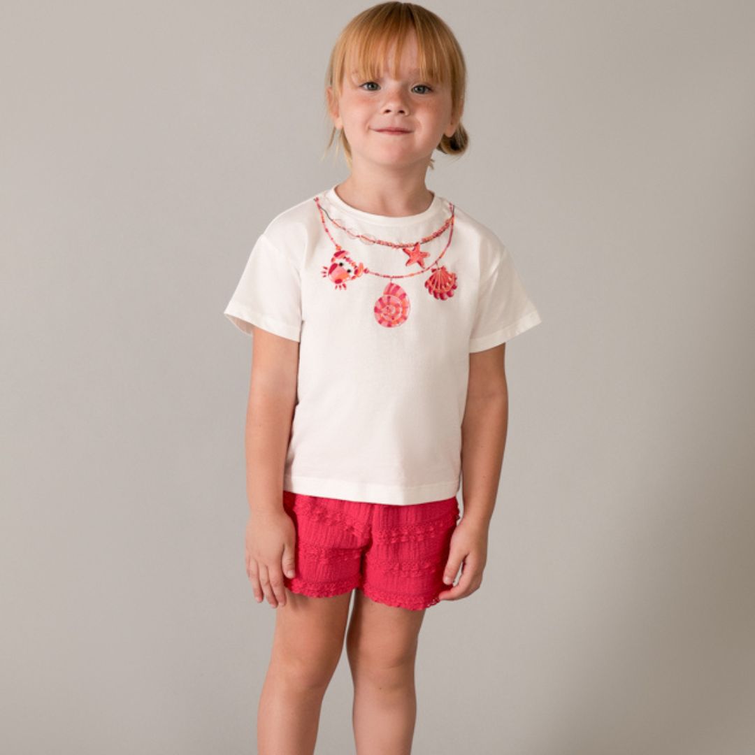 Camiseta de Algodón: Confeccionada en un tejido suave y transpirable. Presenta un cuello redondo y un original estampado de collar veraniego con motivos marinos (conchas y estrellas de mar) en tonos amapola y fucsia, que aporta un toque divertido y colorido.