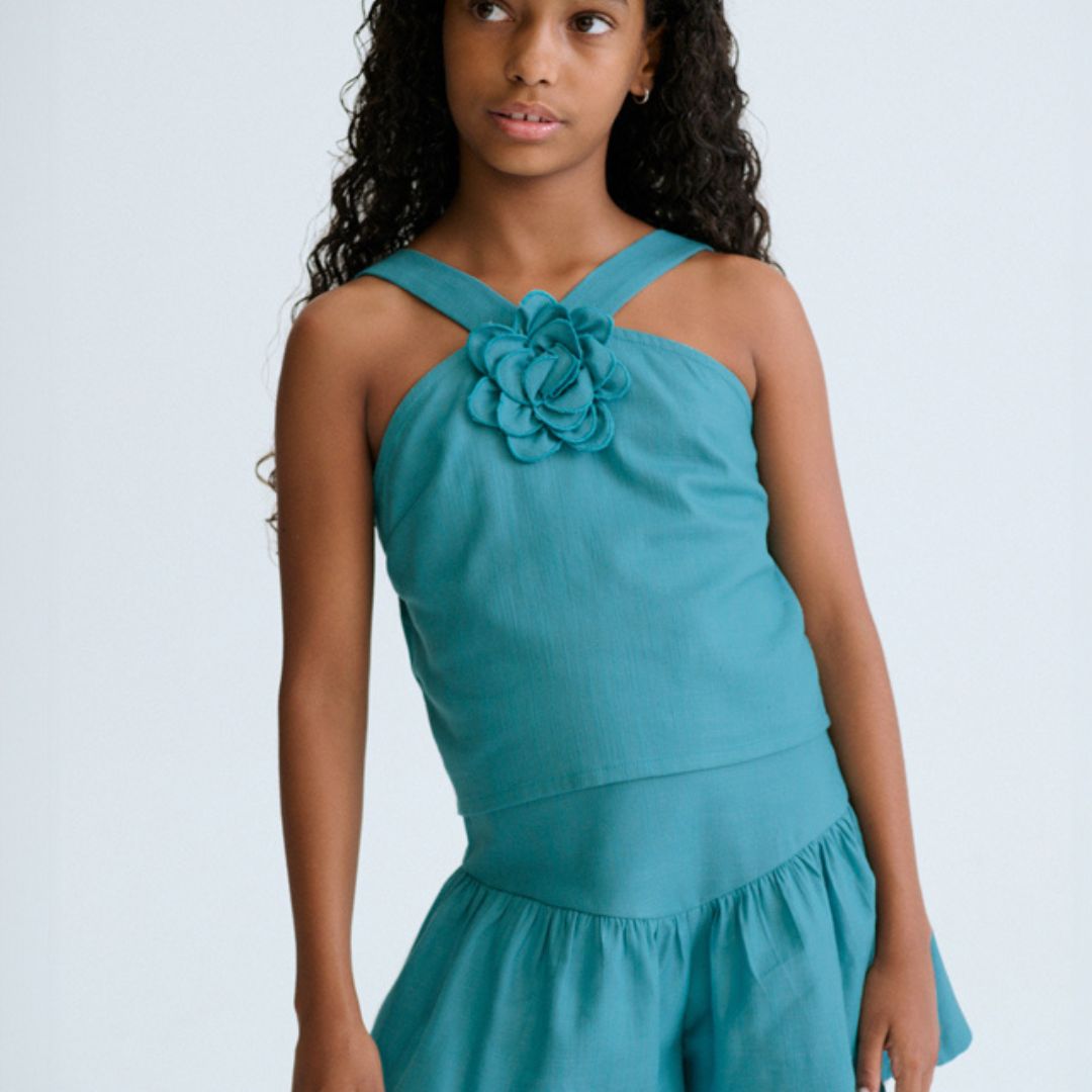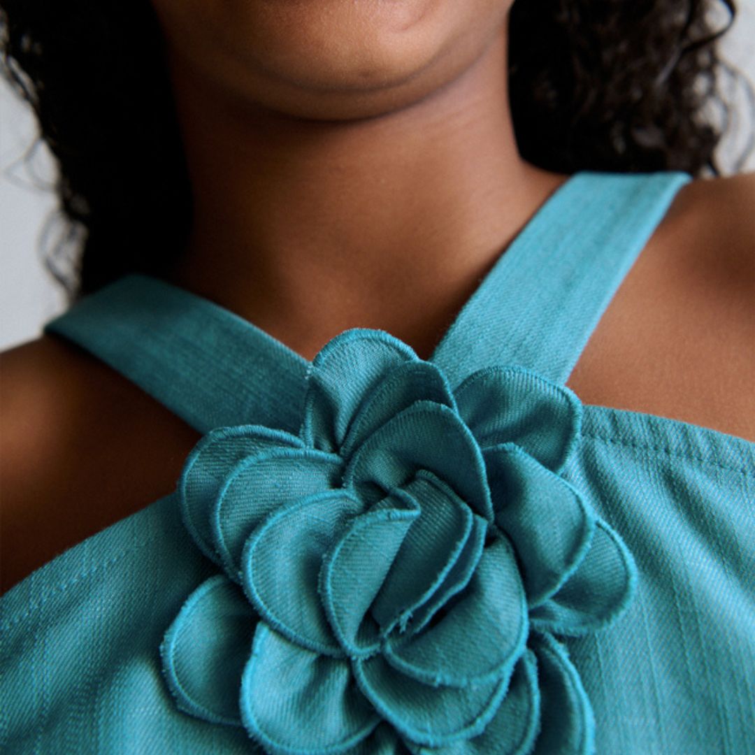 Top Halter con Detalle 3D: El top presenta un sofisticado cuello tipo halter con tirantes cruzados. El protagonismo se lo lleva una gran flor aplicada en relieve en el centro del escote, aportando un aire romántico y moderno.