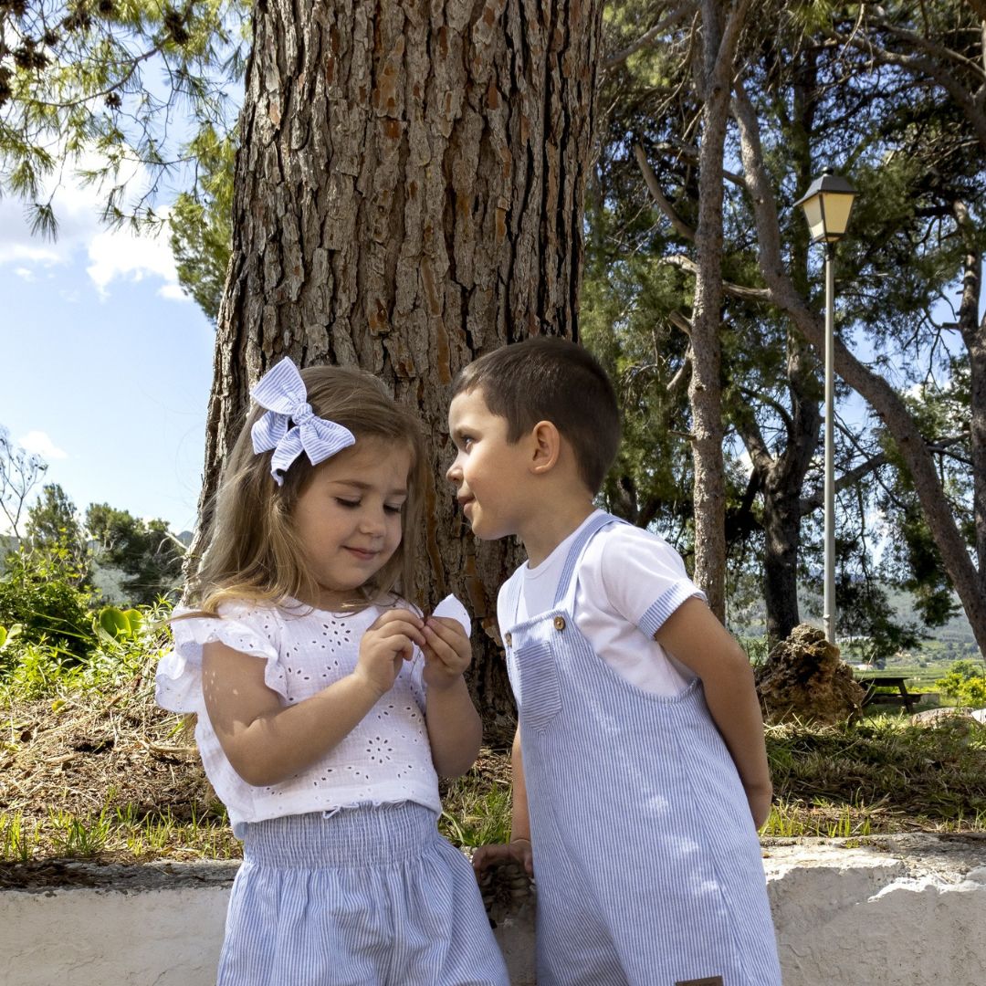 El Conjunto Kerala Celeste de Calamaro es la esencia del verano capturada en una prenda. Este conjunto de dos piezas para niña combina la delicadeza del bordado suizo con la frescura de las rayas marineras, creando un look luminoso y cómodo para los días de calor.