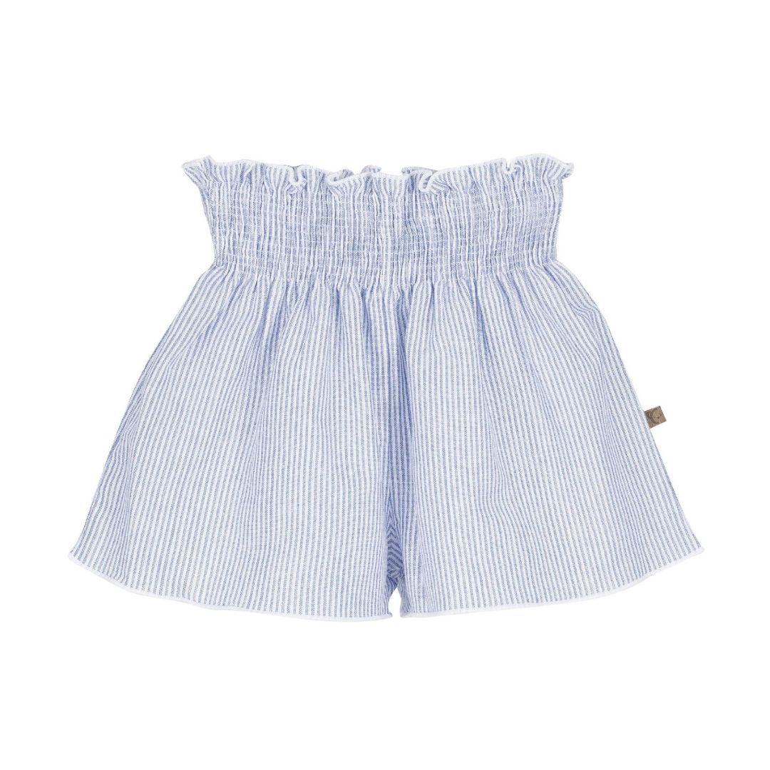 Pantalón Corto (Short): Diseñado en un suave tejido de rayas verticales en celeste y blanco (seersucker), un clásico atemporal que nunca pasa de moda.