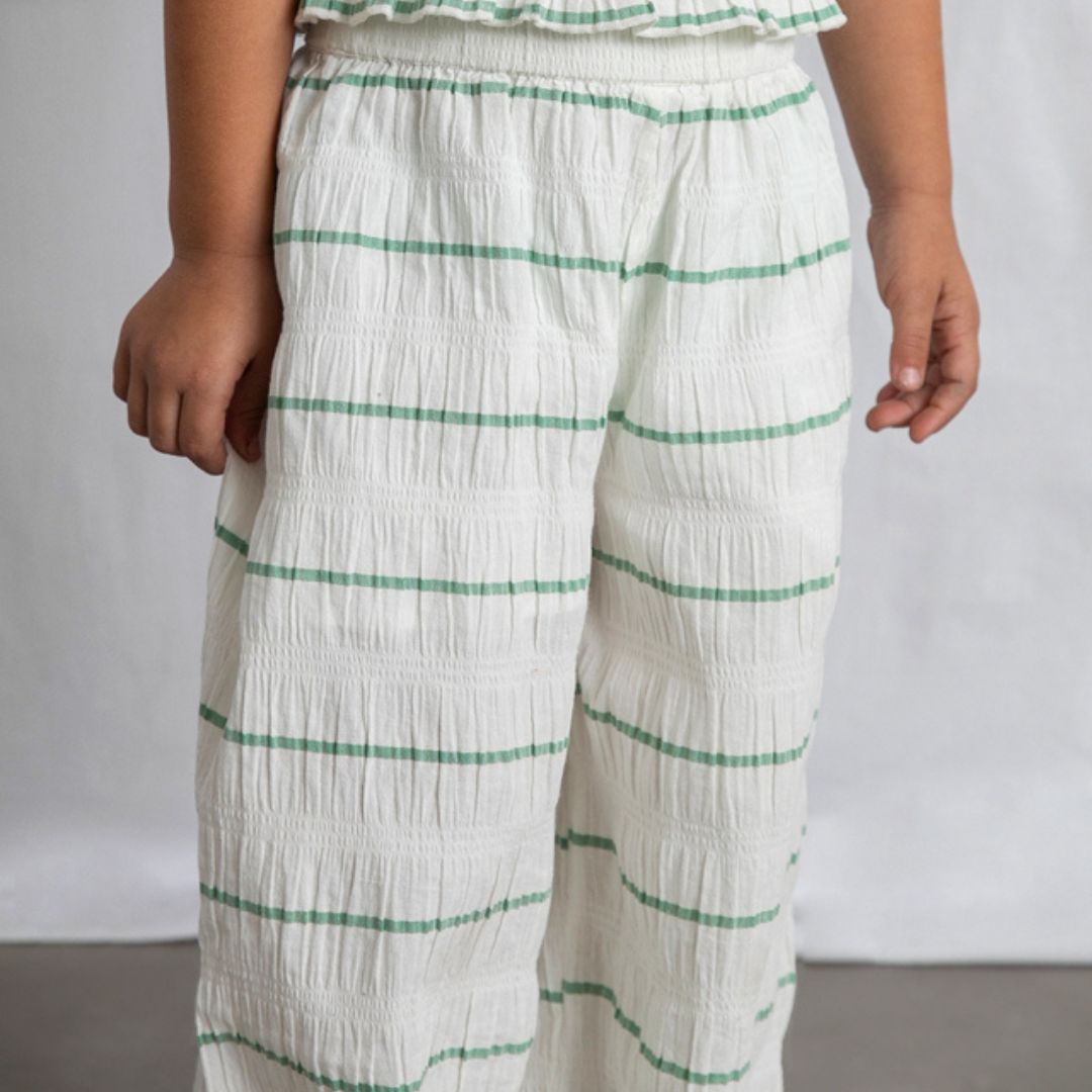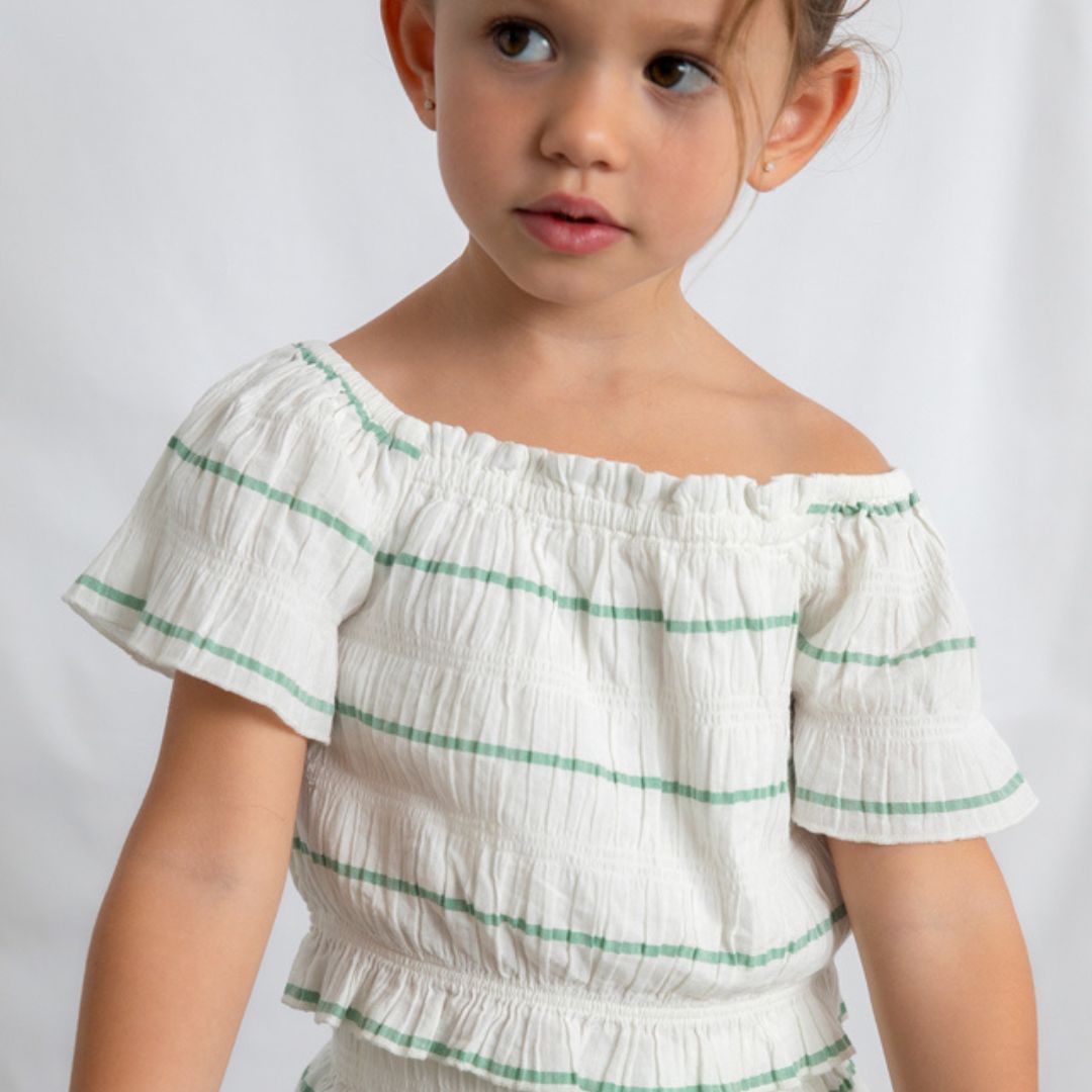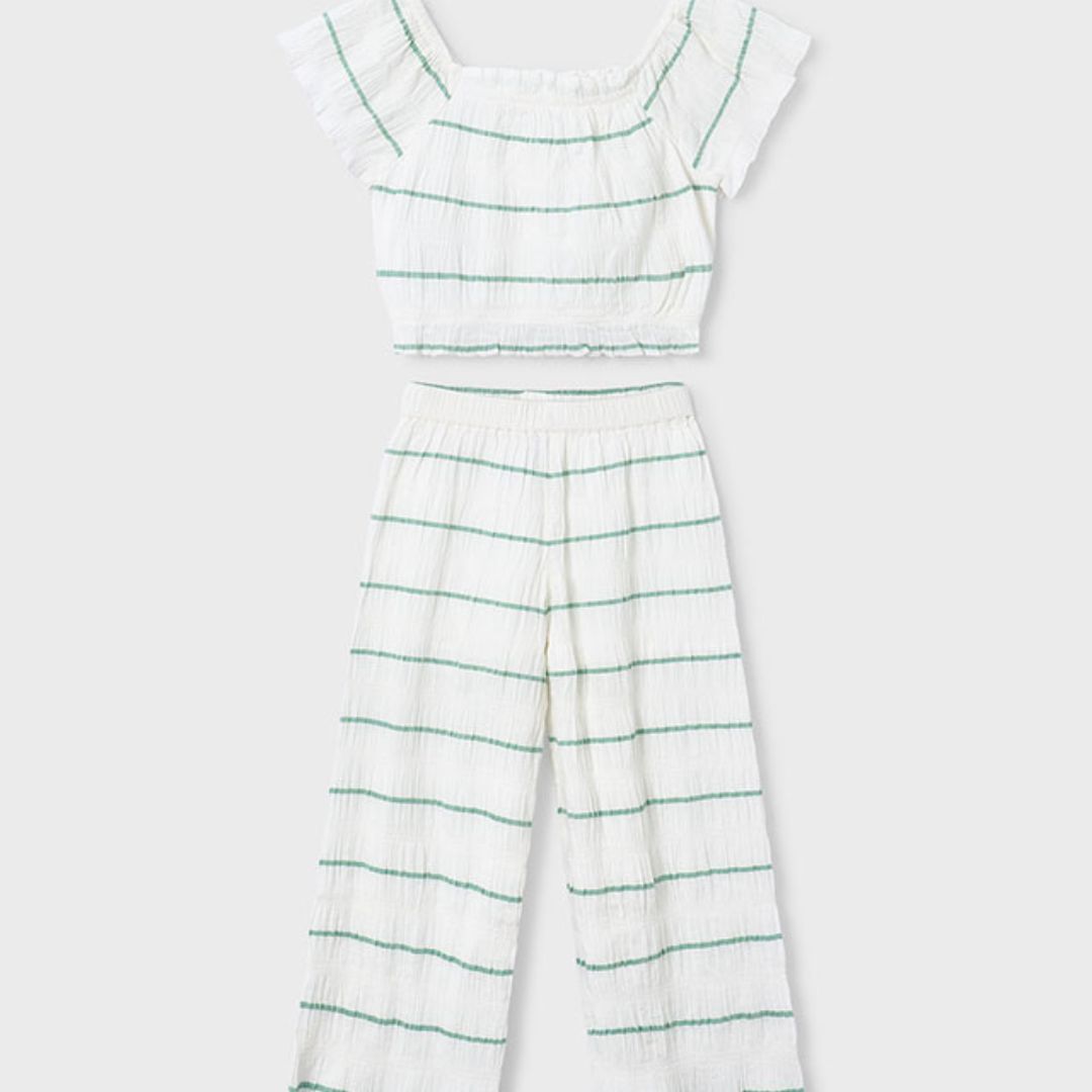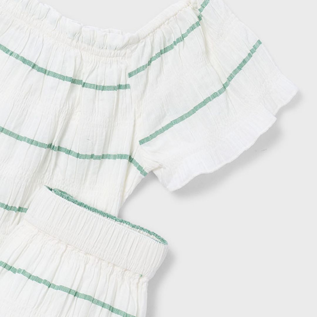 Disfruta de la máxima ligereza con este conjunto de dos piezas de Mayoral, una opción ideal para los días más calurosos del año. Con un diseño de rayas finas en color verde sobre fondo blanco, este set destaca por su tejido con textura arrugada (seersucker), que aporta un aire fresco, bohemio y muy cómodo para cualquier actividad veraniega.