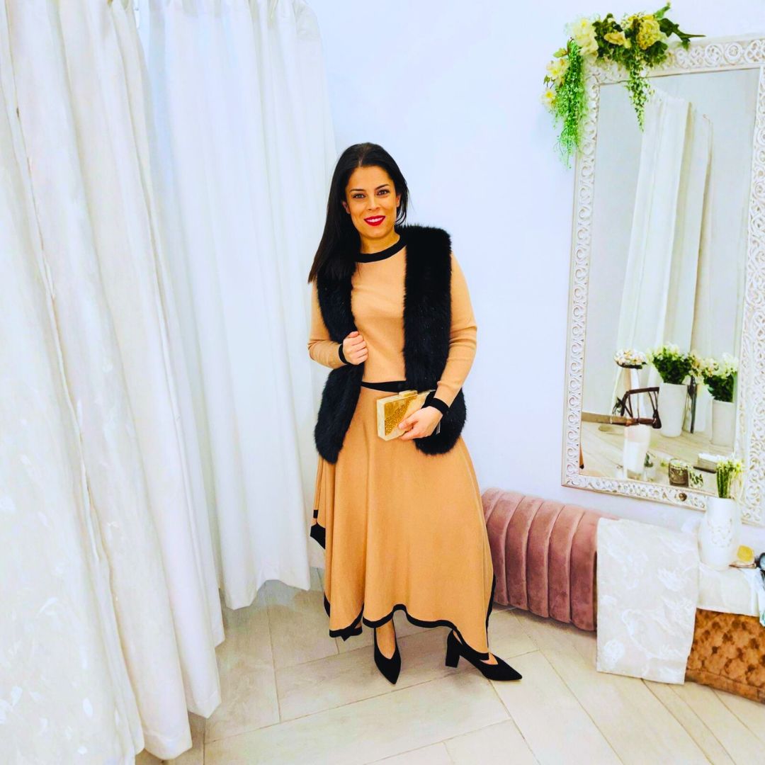 Elegante conjunto de punto compuesto por top de manga larga y falda midi evasé.