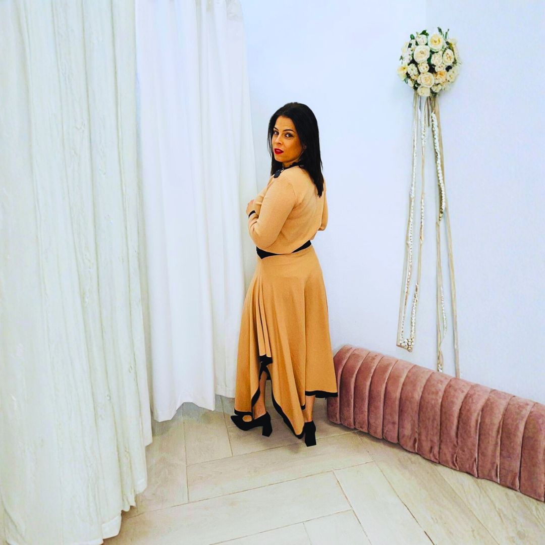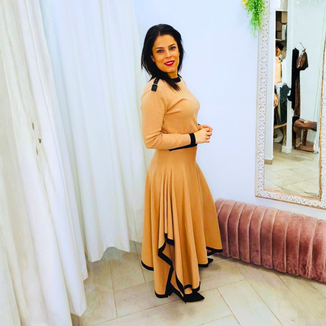 El top presenta detalle decorativo en el hombro y acabados en negro en puños y cintura, mientras que la falda fluida con vivo negro en el bajo crea un movimiento femenino y favorecedor.