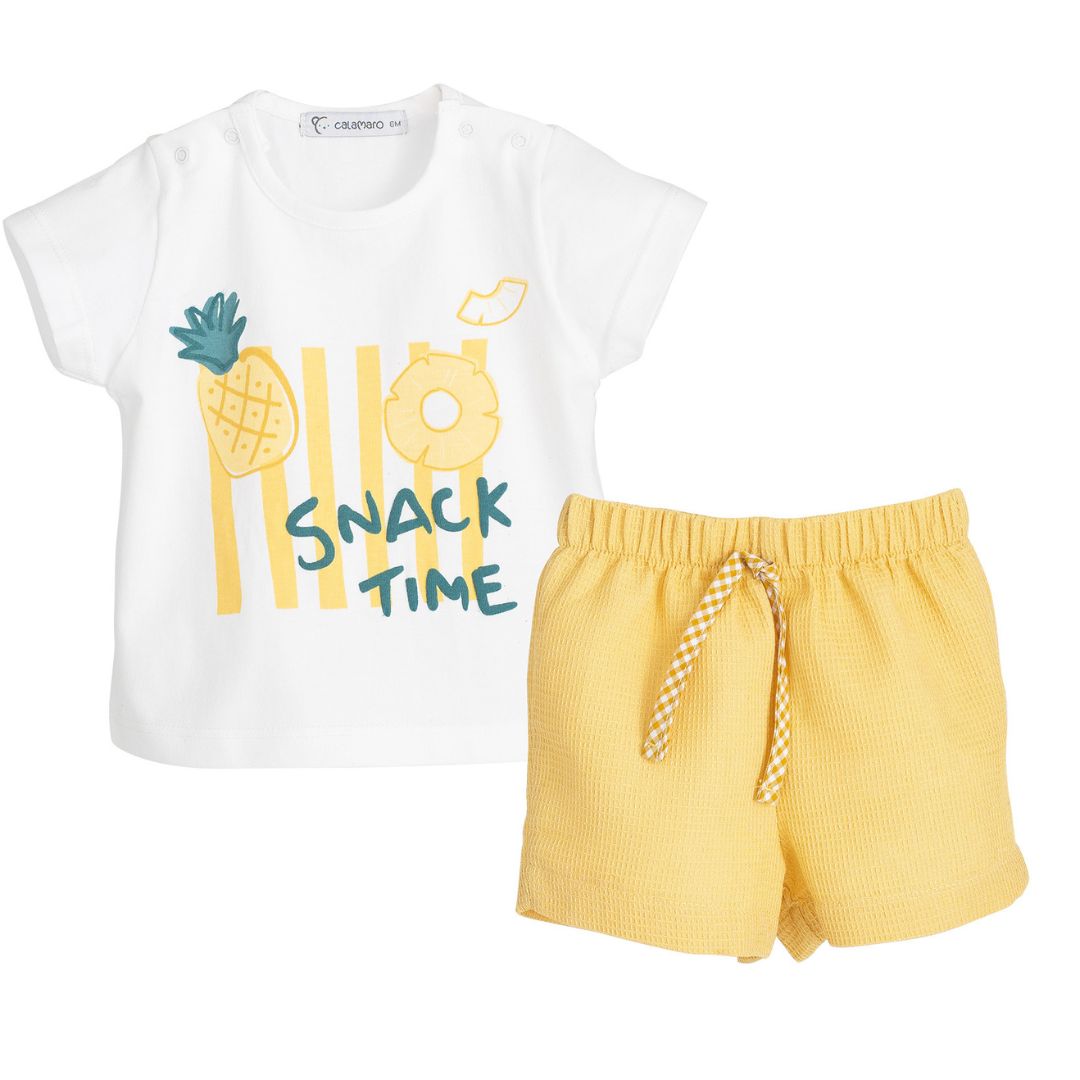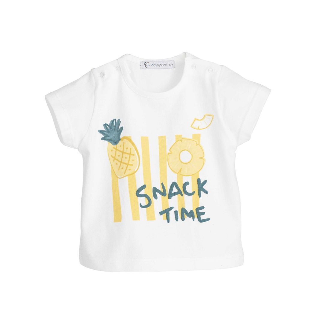 Camiseta de Algodón: En color blanco puro, presenta un divertido gráfico frontal con el mensaje «Snack Time» acompañado de alegres piñas. Cuenta con apertura de corchetes en ambos hombros para que vestir al bebé sea rápido y sencillo.
