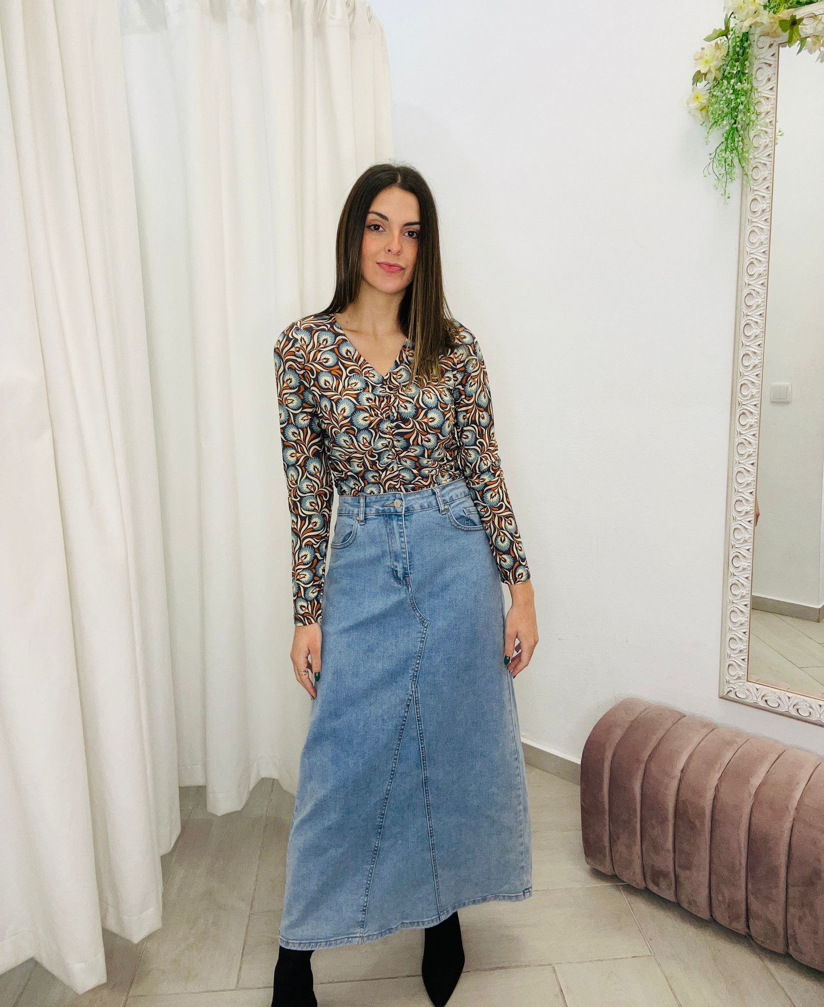 Luce un estilo clásico y cómodo con nuestra falda vaquera larga, diseñada para ofrecer versatilidad y frescura en cualquier ocasión.
