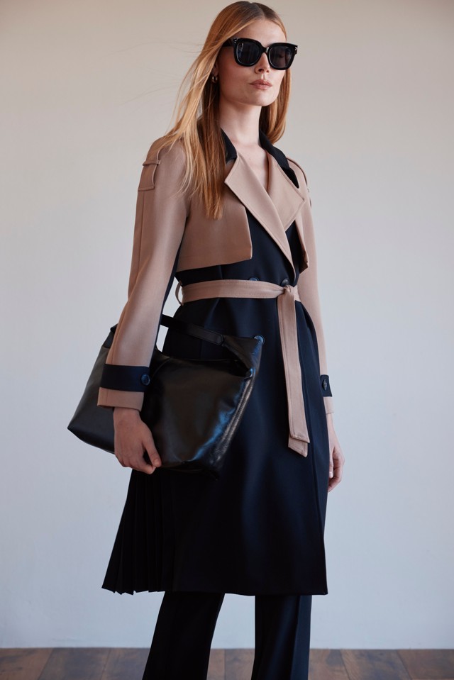 Gabardina combinada en tonos camel y negro de la firma ARGGIDO, una prenda icónica que combina elegancia y modernidad. Su diseño bicolor realza la silueta con un estilo sofisticado y actual, ideal para completar looks urbanos o más formales.