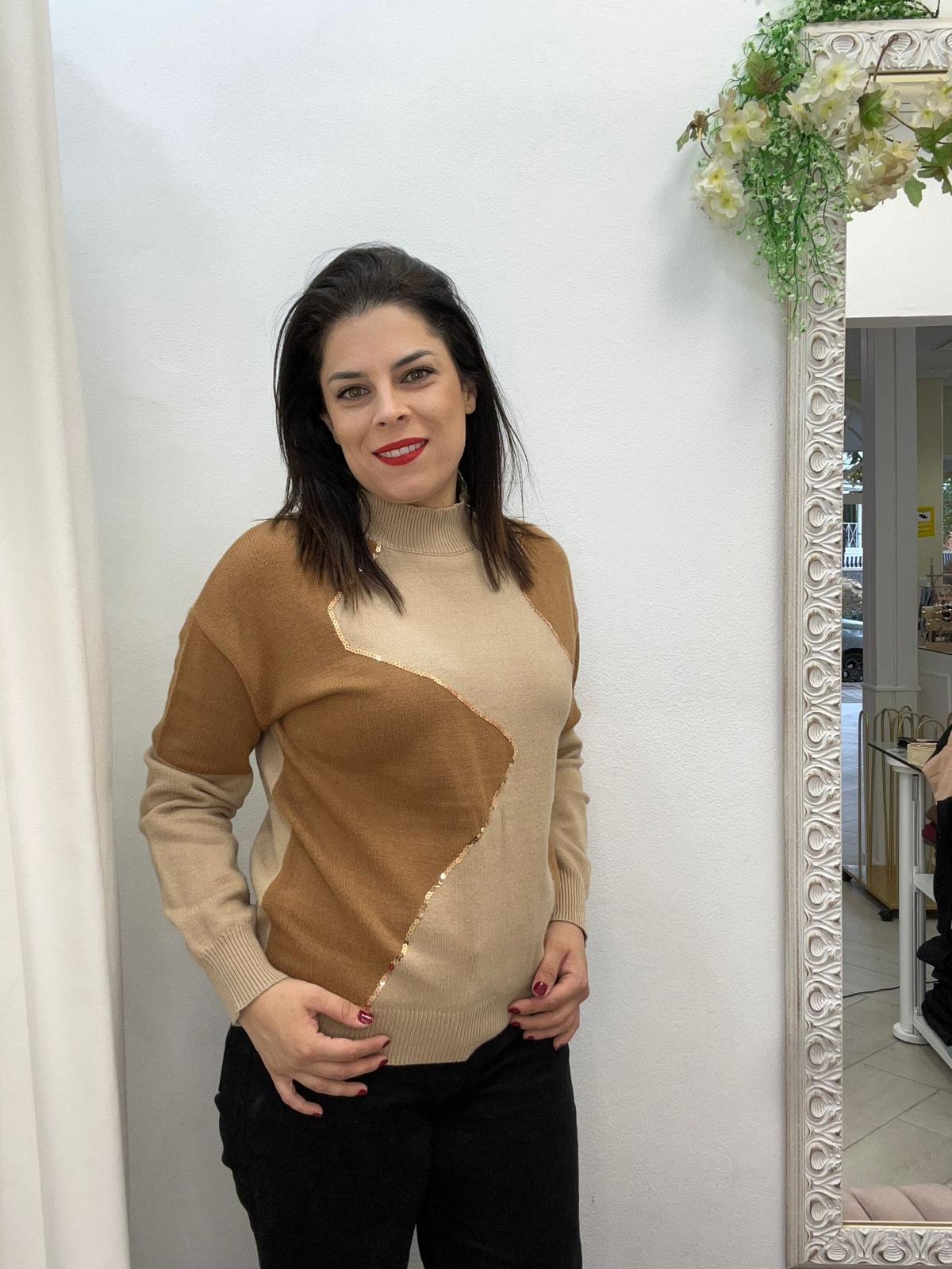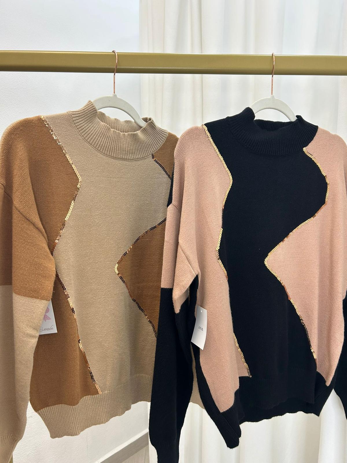 Este jersey combina estilo y comodidad con un diseño moderno en bloques de color. Confeccionado en un tejido suave y cálido, destaca por sus líneas asimétricas decoradas con delicidas lentejuelas doradas que aportan un toque de brillo sutil y elegante. Disponible en dos combinaciones: camel-beige y camel- negro. Su cuello redondo acanalado y su corte relajado lo convierten en una prenda ideal para crear looks casuales o más sofisticados según el momento.