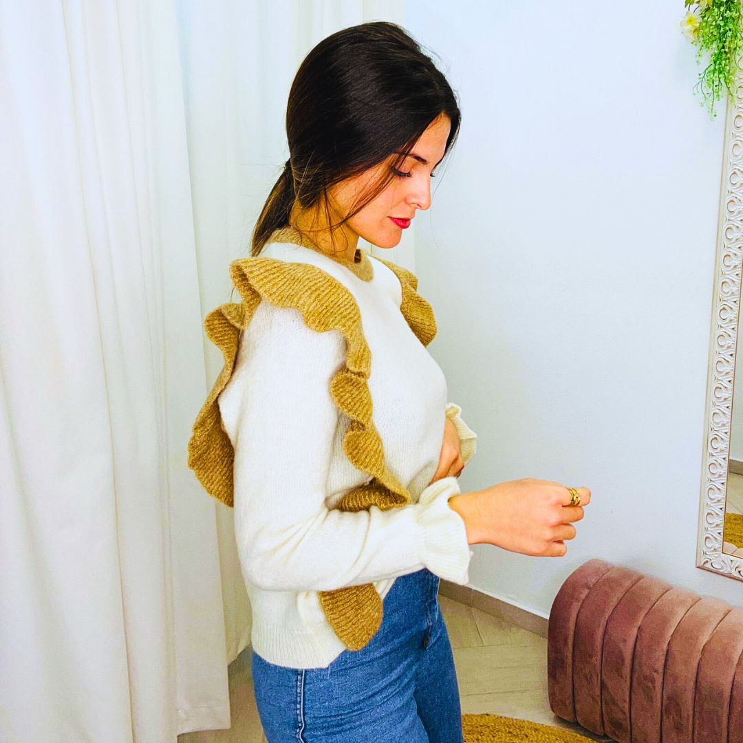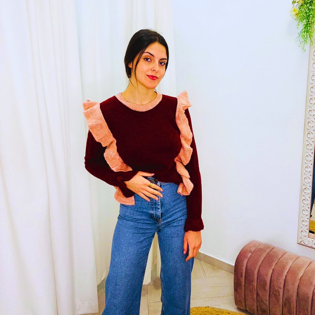 Jersey con volantres en contraste, diseñado para aportar un estilo femenino y sofisticado a tu armario, disponible en color granate con volantes en rosa, beige con volantes en camel y azul marino con volantes en azul.